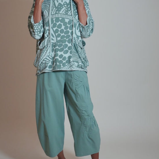 Done in a smooth French terry knit, this darling hoodie has a V neckline with an oversize hood; the body is deliberately boxy, with a kangaroo pocket in front. The dolman sleeves are elbow length, ideal for nearly year-round wear.