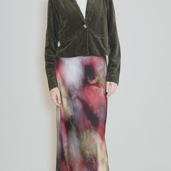 So yummy! Done in a super-soft velour with a subtle sheen, this trim blazer has long sleeves, a set-in shoulder and a single button closure at the bustline. The silhouette is a bit shrunken, hitting at the high hip on most wearers, and two pockets sit on the hips. Running a bit on the small side for the brand.