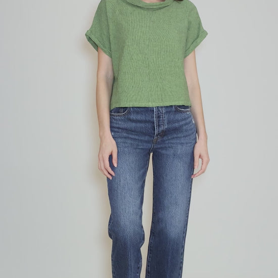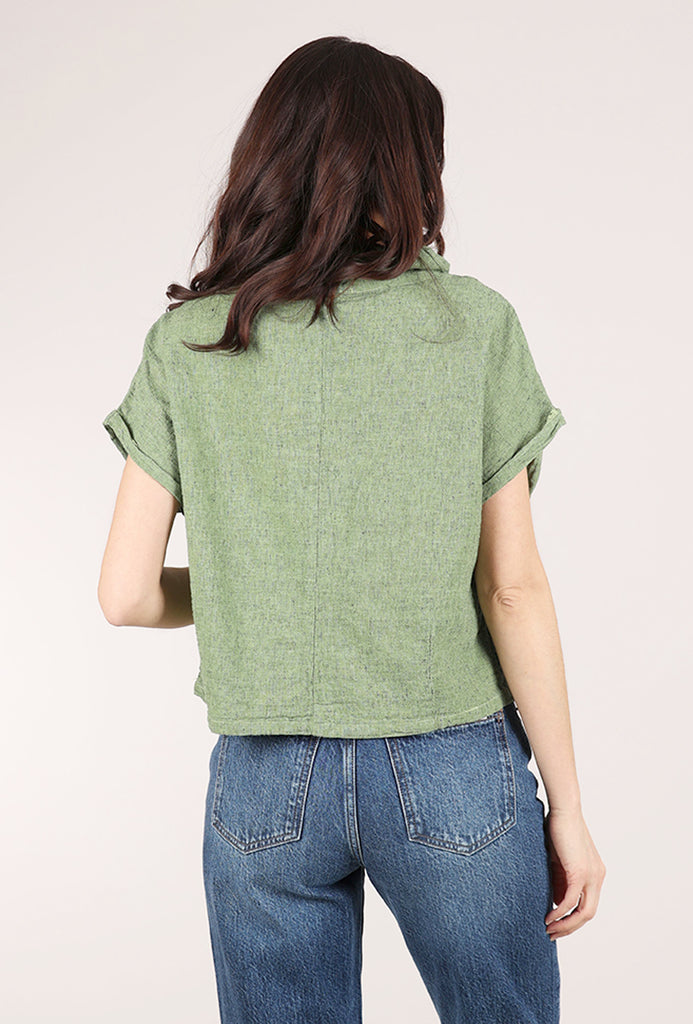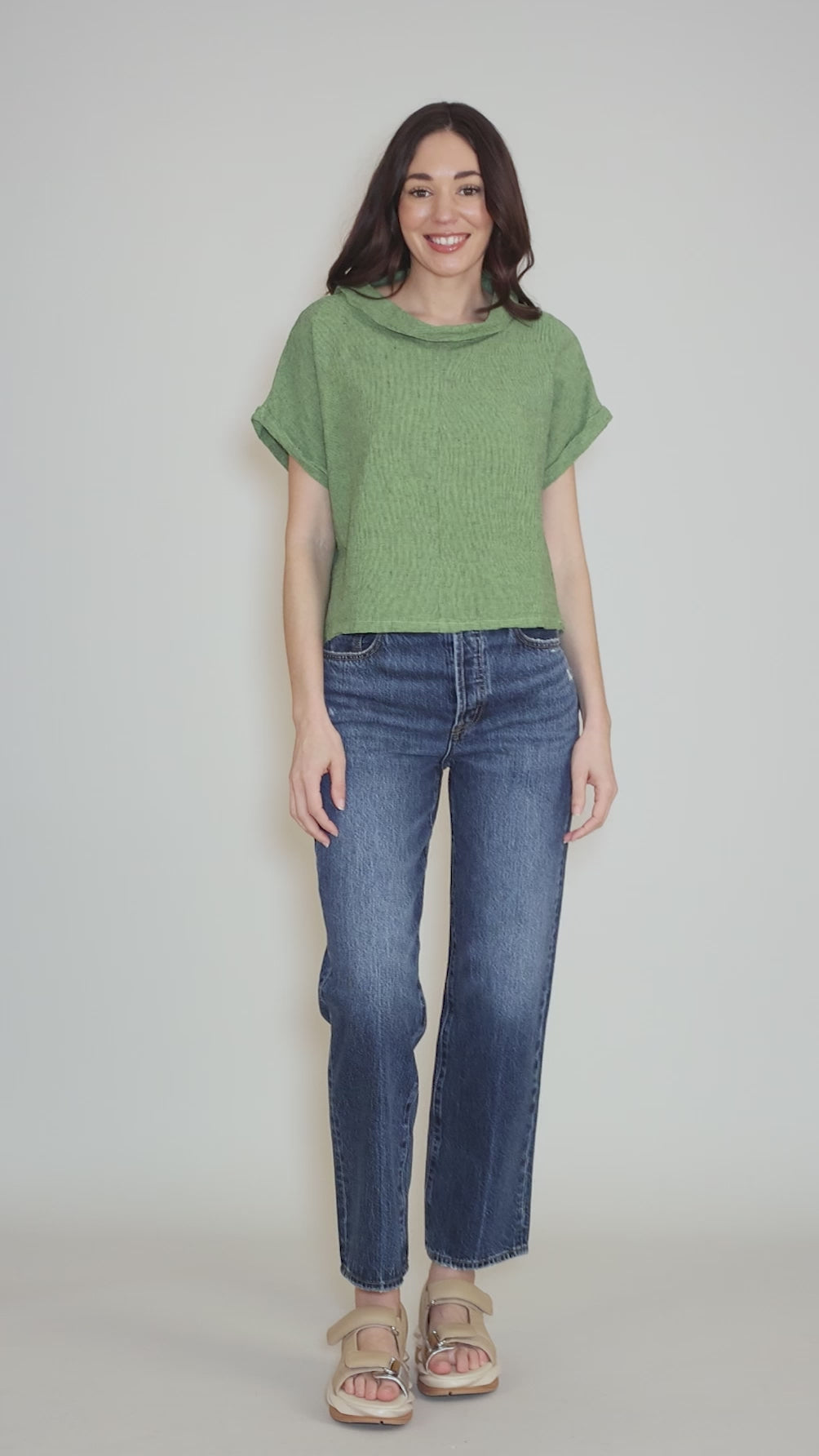 A favorite style among our in-store customers, this simple, easy blouse has short rolled sleeves, a draped neckline and a boxy silhouette. This top's fit is easy and relaxed, and its hip-skimming length makes it a nice partner for fuller-legged pants. It's done in a soft cotton-linen blend with a faint crosshatch pattern. Runs true to size to slightly large.
