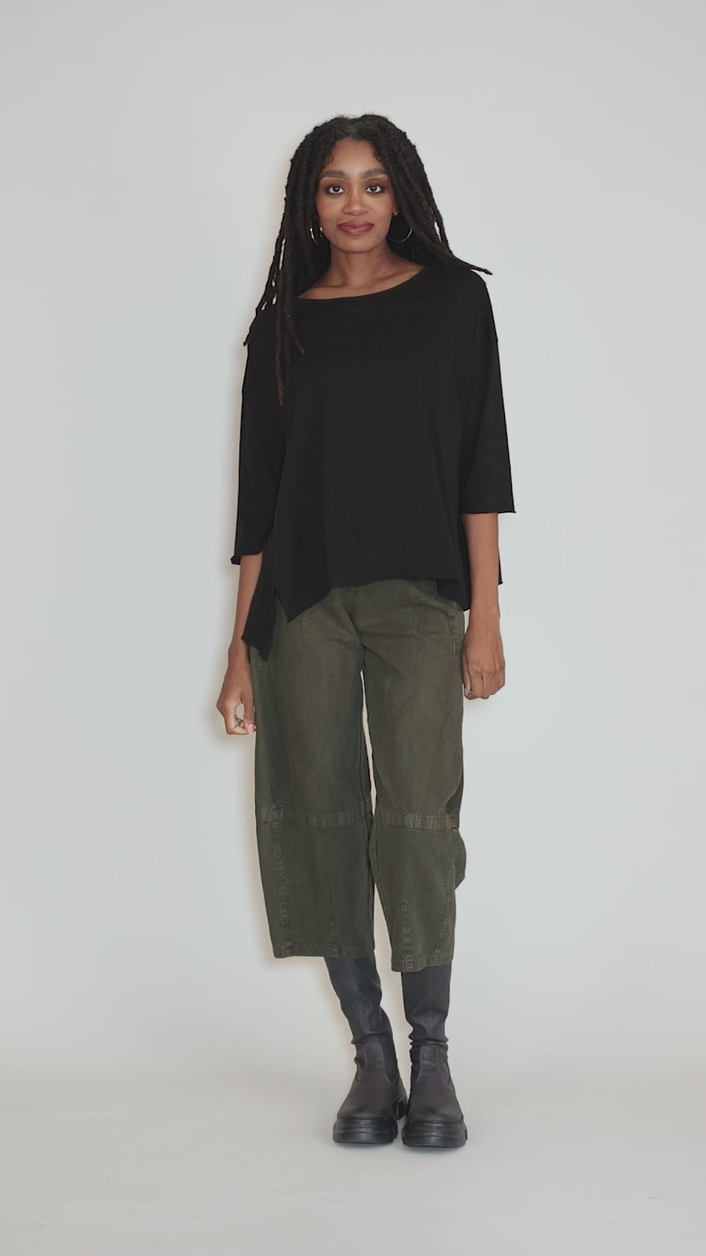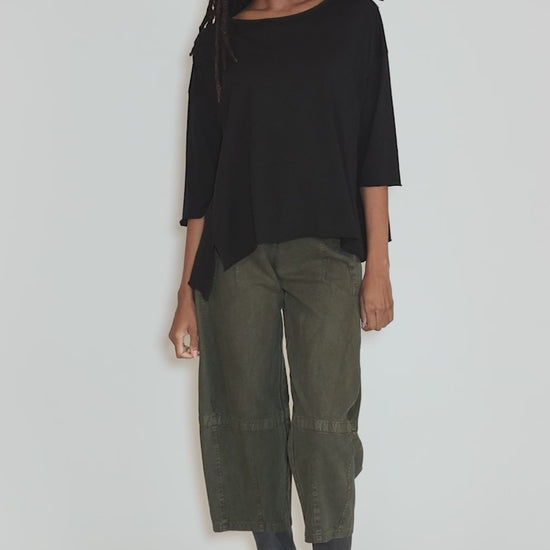 Done in a super-soft cotton jersey, this T-shirt is a customer favorite, especially among our shorter, rounder gals! It has three-quarter-length sleeves, a modest neckline and a full, swingy shape. We find that it runs quite large.