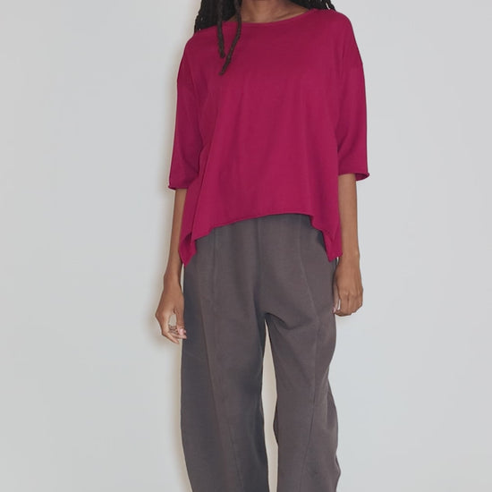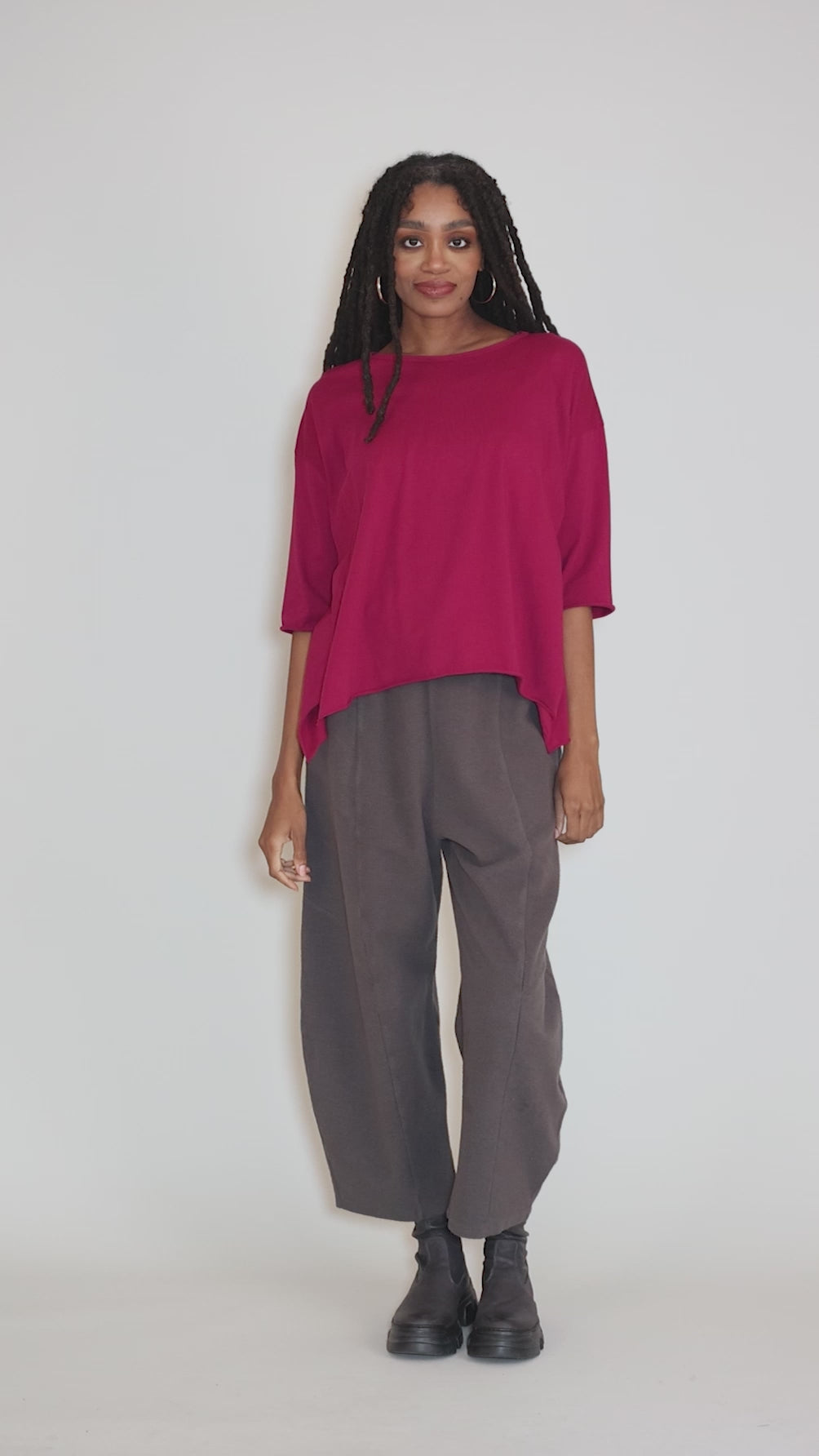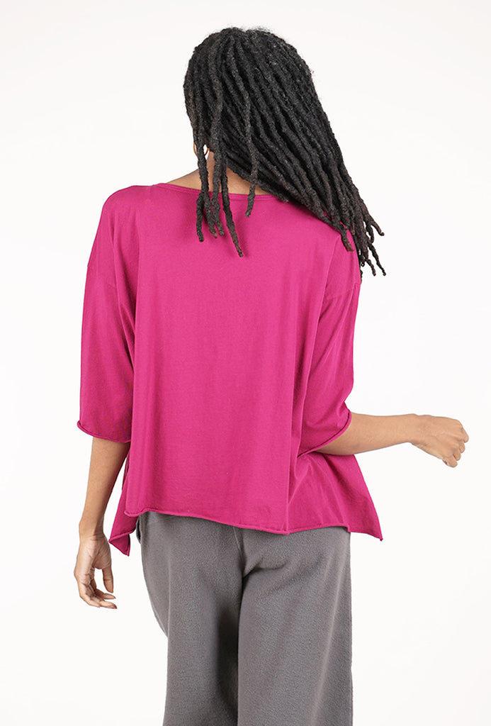 Done in a super-soft cotton jersey, this T-shirt is a customer favorite, especially among our shorter, rounder gals! It has three-quarter-length sleeves, a modest neckline and a full, swingy shape. We find that it runs quite large.