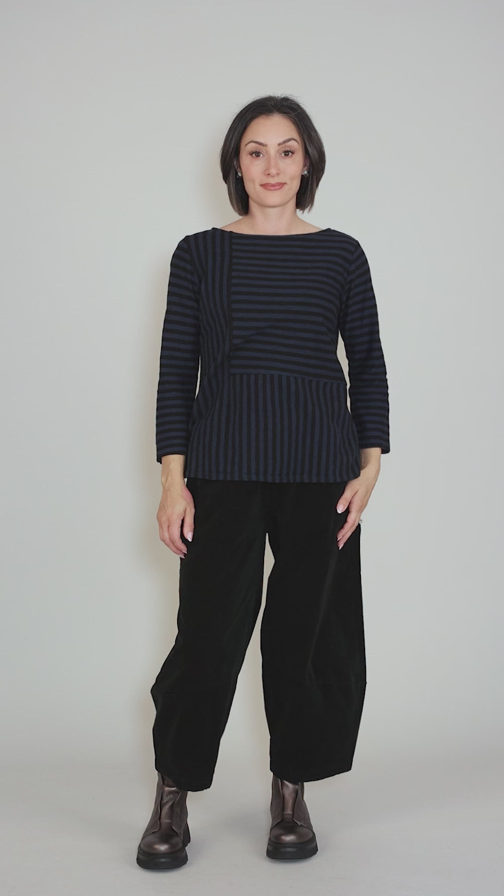 For those who are tired of cropped, boxy, tops, check out this cutie from Cut Loose! Done in the brand's signature cotton-linen slub jersey, it has a boat neckline, a set-in shoulder and three-quarter-length sleeves. The body is slightly elongated and a slightly fit-and-flare in silhouette. We love the way the stripes change direction throughout. Running true to size to slightly small for the brand.