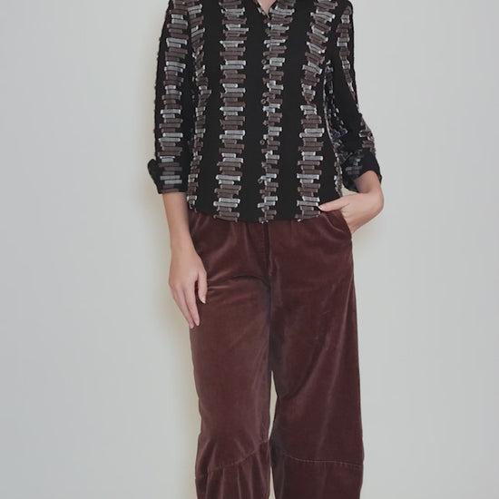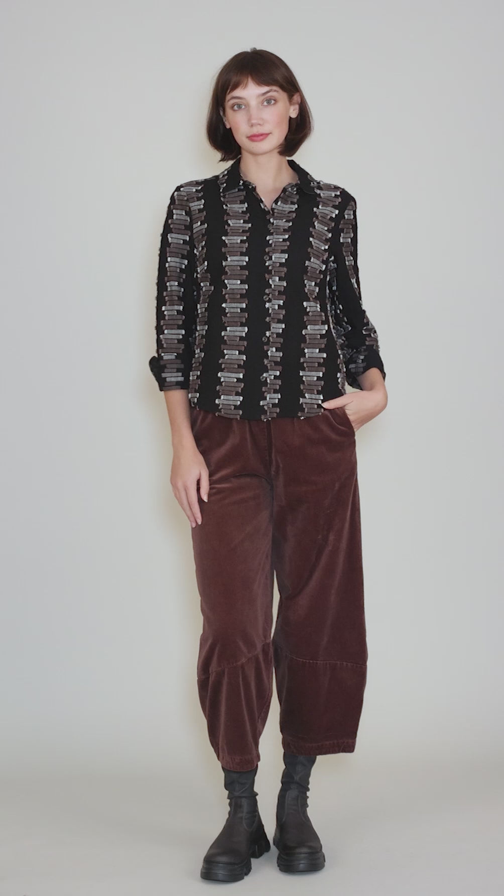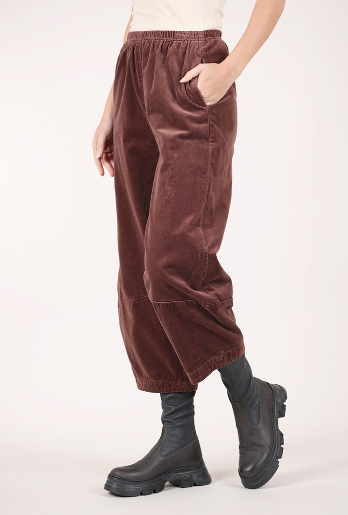 Done in a soft, mid-weight cotton velvet, these roomy pants have an elastic waistband, hip pockets and full, lantern-shaped legs that end above the ankle. The fit is relaxed, but the effect is more tailored.