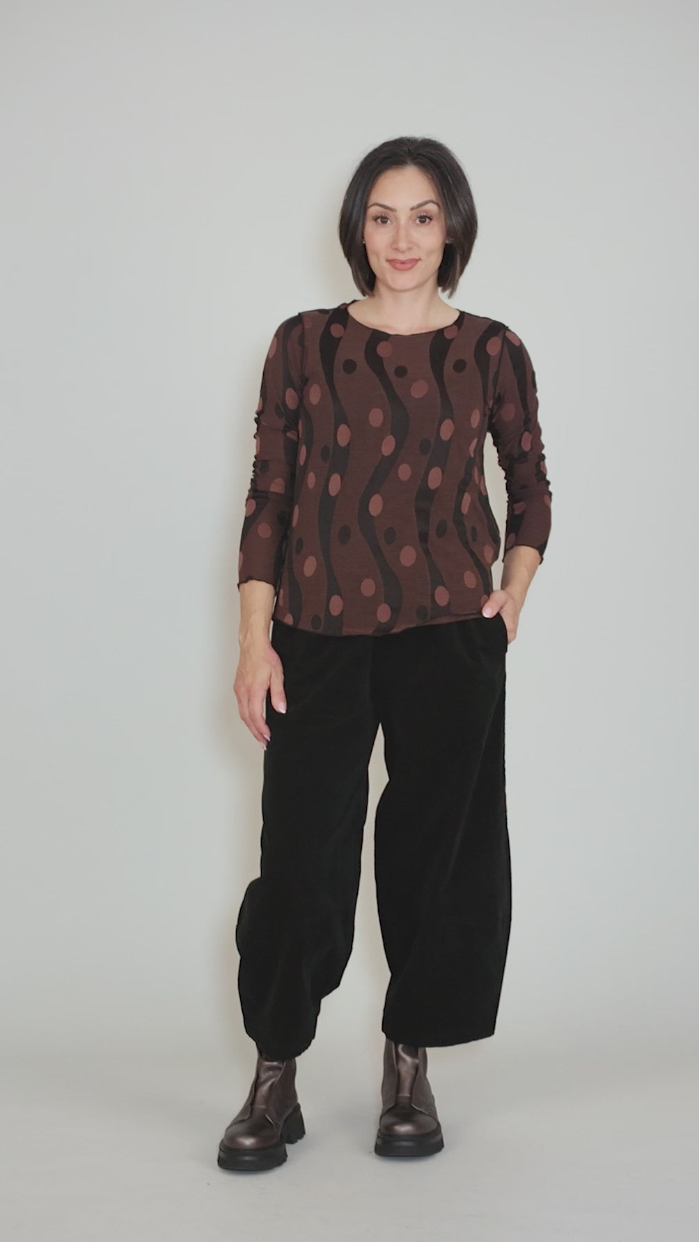 We love this new knit from Cut Loose! It's a smooth knit blend with a dotty/swirly jacquard pattern throughout. The tee has a rounded neckline, a set-in shoulder and a three-quarter-length sleeves. The silhouette is quite tailored and closer to the body than many CL pieces, but the fit is not constricting. Terrific for layering or on its own!