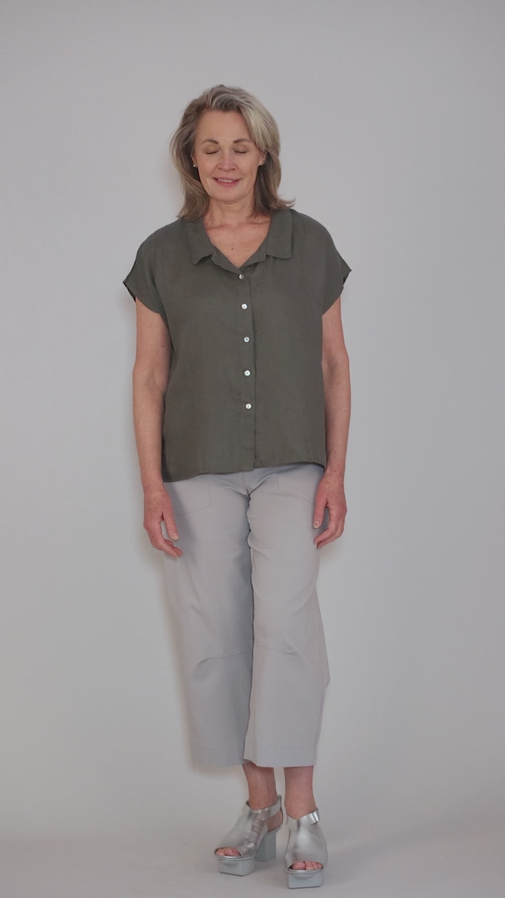 Made in a crisp, long-staple linen, this easy shirt has short sleeves, a small shirt collar and a button-front placket. The silhouette is deliberately boxy, with a hip-skimming length and relaxed fit.