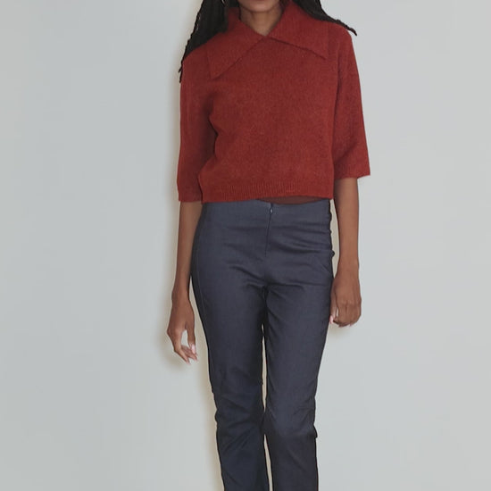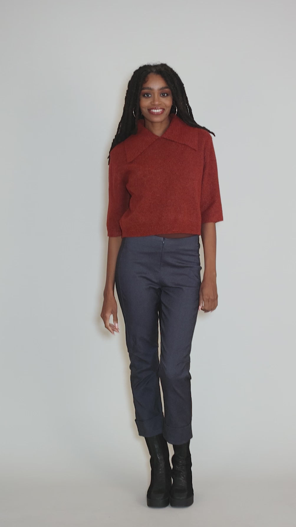 How cute is this little sweater! It's knit in a soft poly blend with absolutely no itch factor, an exaggerated collar, a slight drop shoulder and elbow-length sleeves. The silhouette is deliberately boxy, with a hip-skimming length and somewhat relaxed fit.