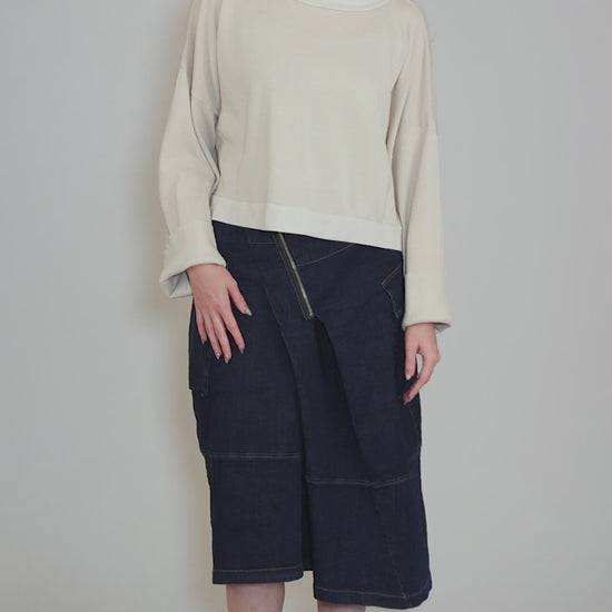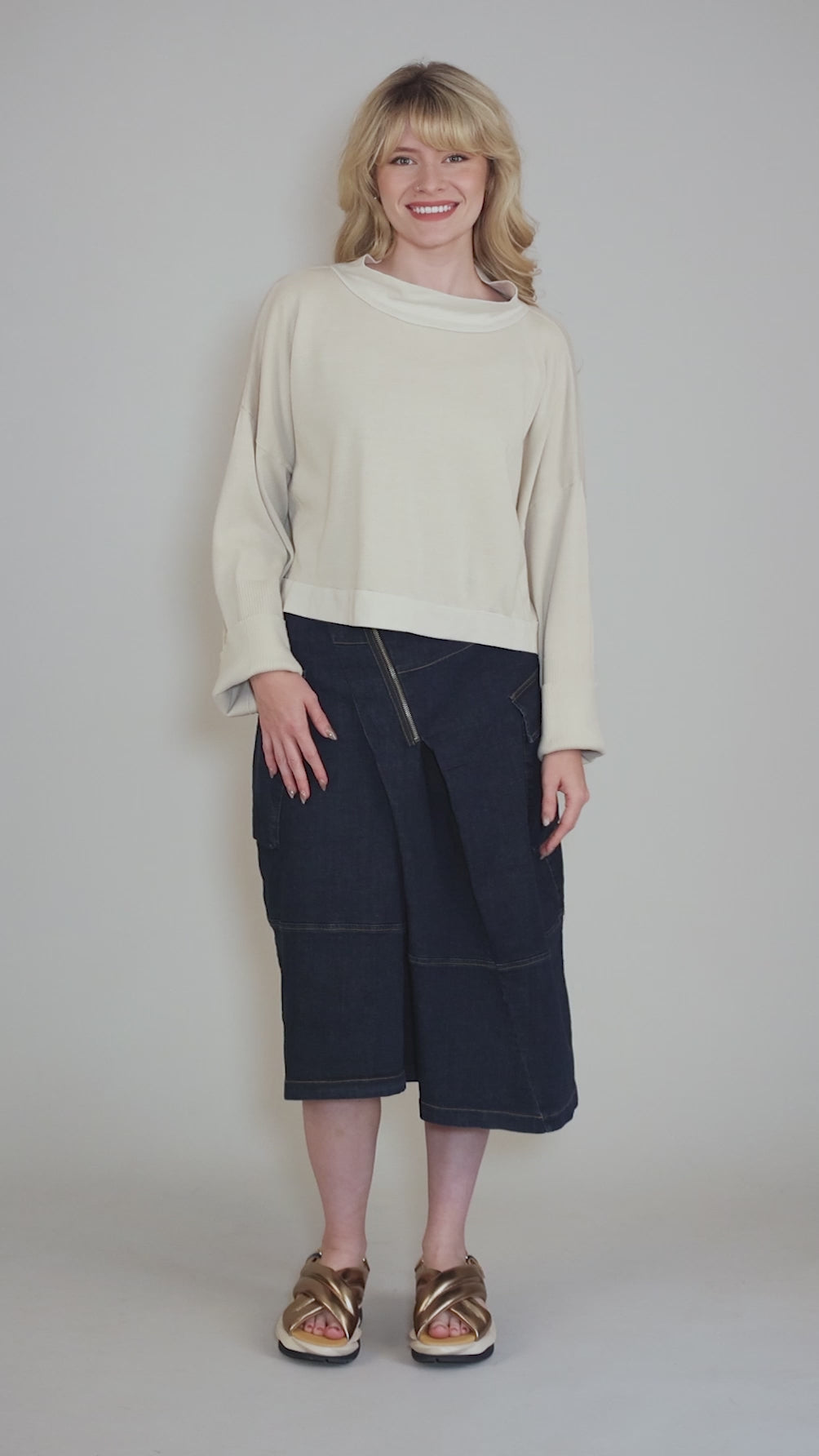 We adore the Ardent top! It comes cotton jersey knit details with a lightweight sweater knit body. Ardent has a wider funnel neckline, with a drop-shoulder construction and extra-long sleeves that end in a loosely knit trim. The silhouette is slightly cropped, making it a terrific partner back to higher-waisted bottoms and skirts.