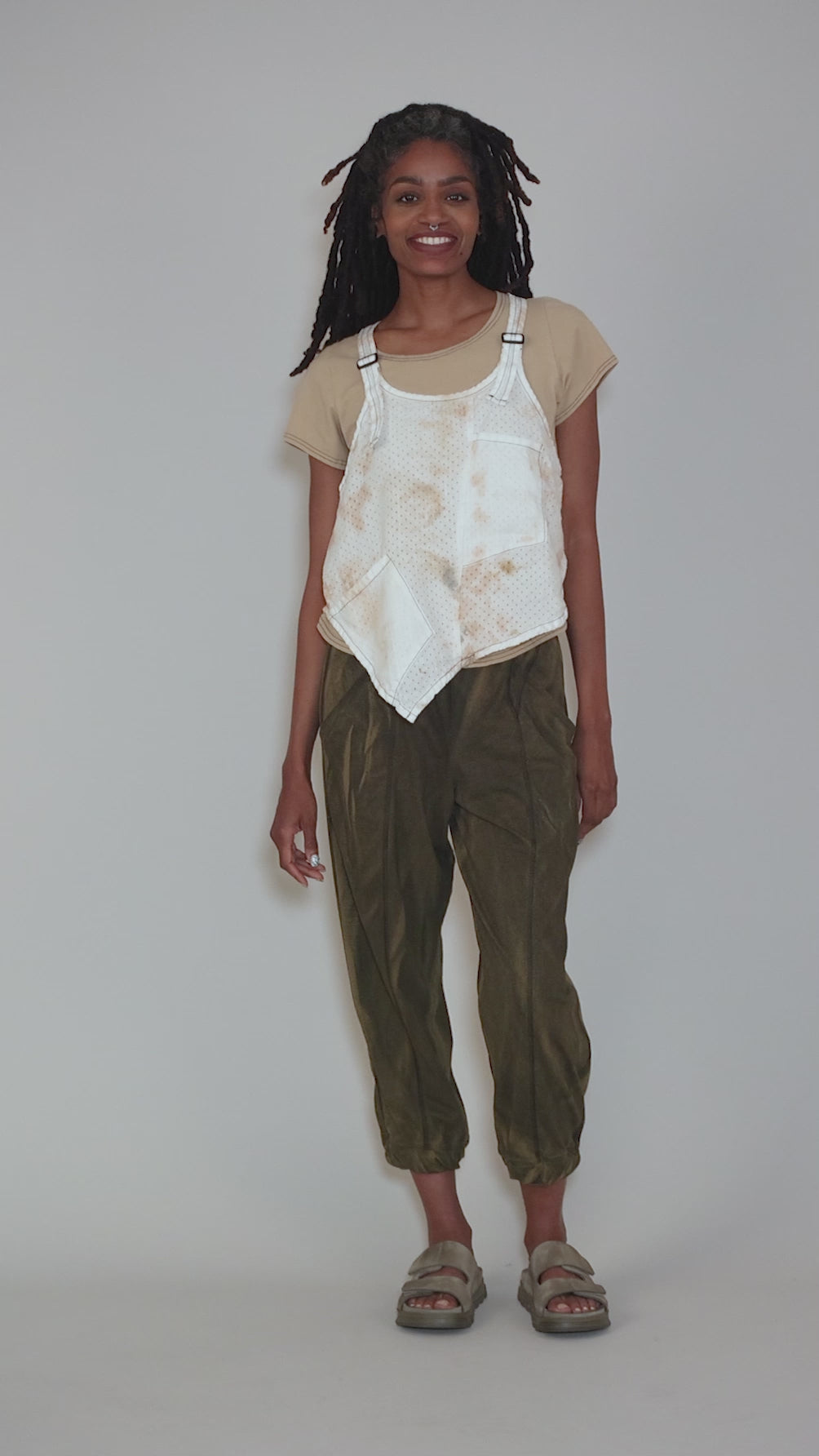 Such a cute piece! Done in a perforated, long-staple linen, this little layering piece features adjustable shoulder straps and handy pockets in front -- so fun! The hemline is uneven, and this version of Flores has been lightly tie-dyed by hand in shades of peach and moss green on a white background.