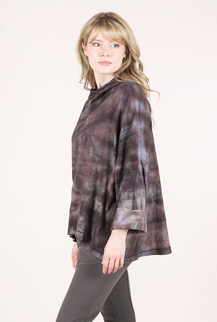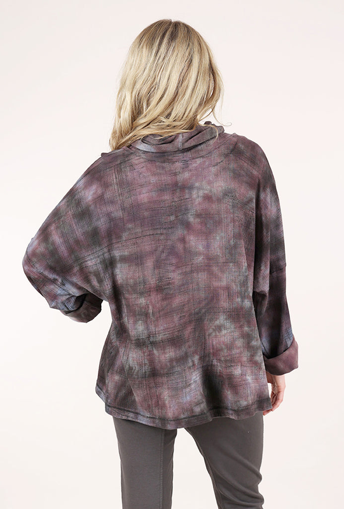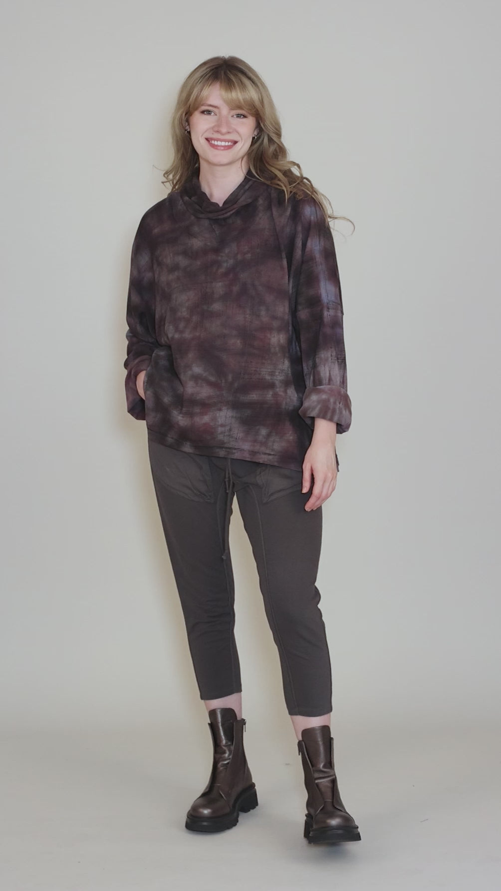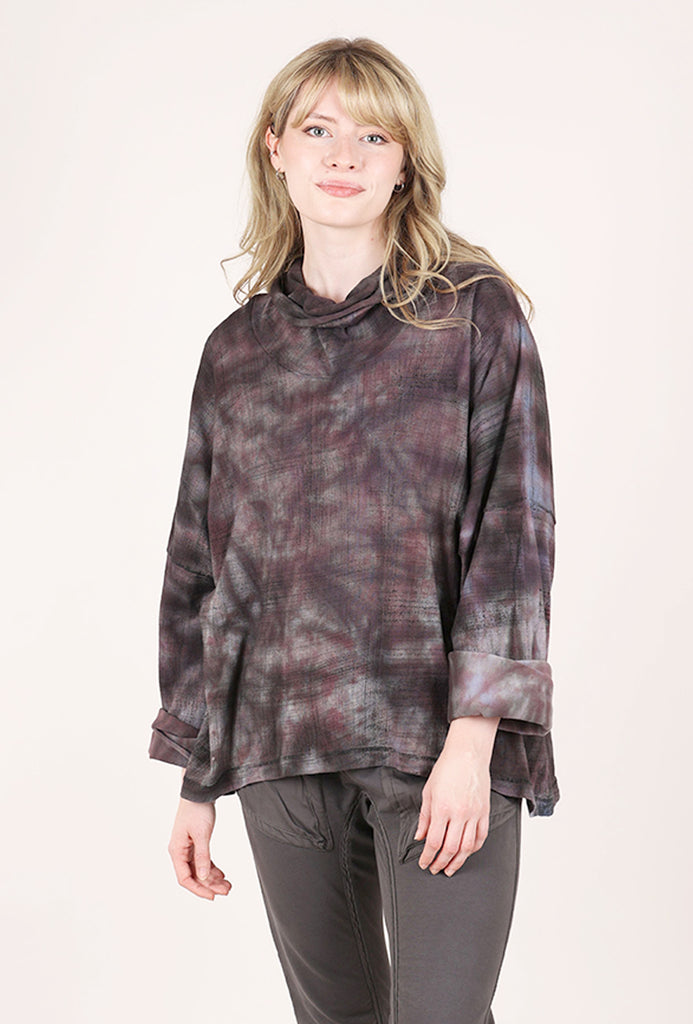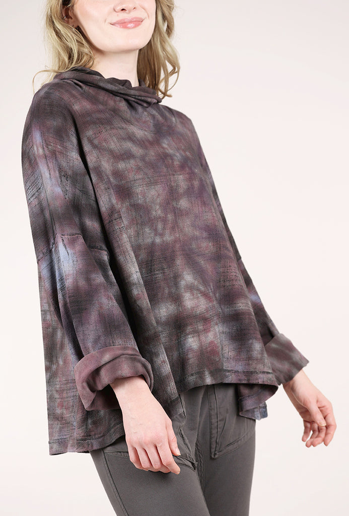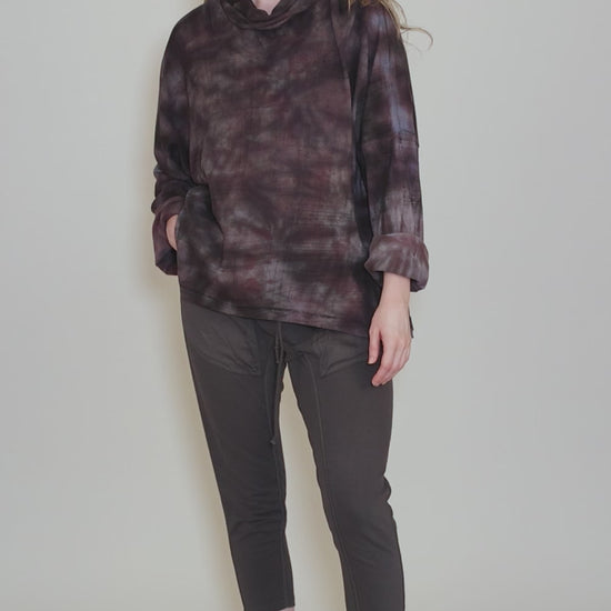 Made in a soft cotton pointelle knit with excellent drape, Grotto has a soft funnel neckline, with extra-long sleeves and a full, A-line silhouette. The hemline is high-low and long enough in back to cover the bum. The sizing here is generous. This version of Grotto has been hand-painted to moody effect, in gorgeous shades of plums and charcoals.