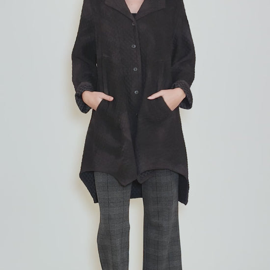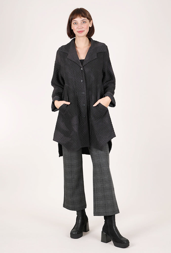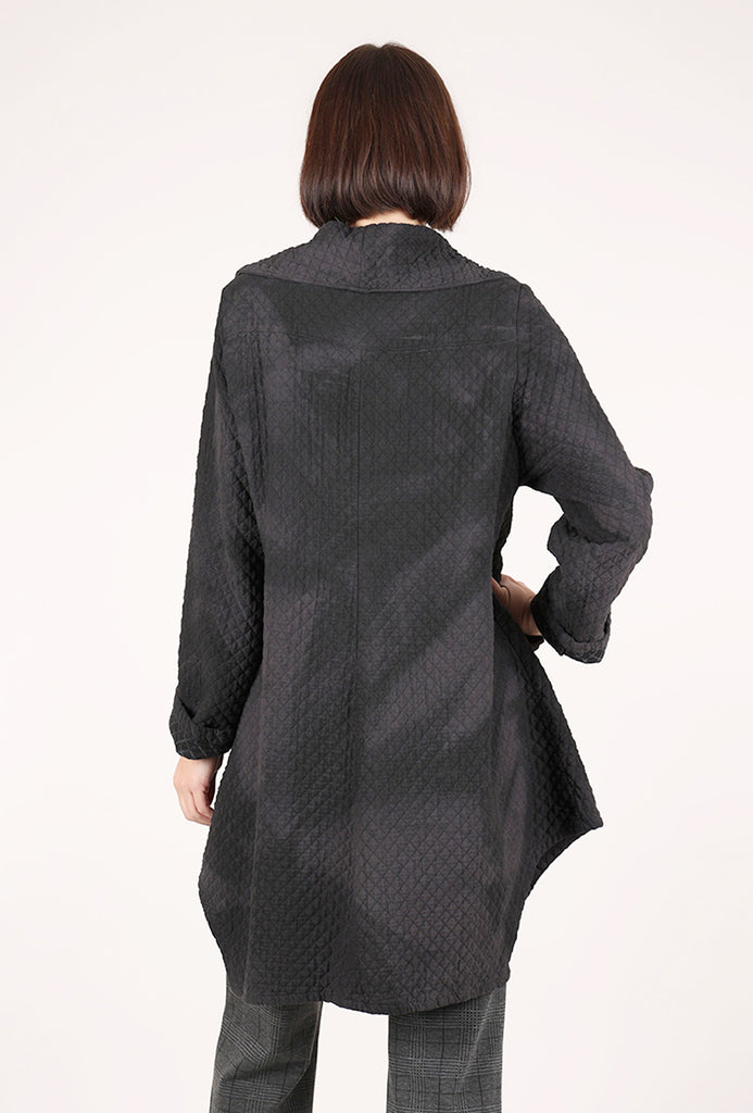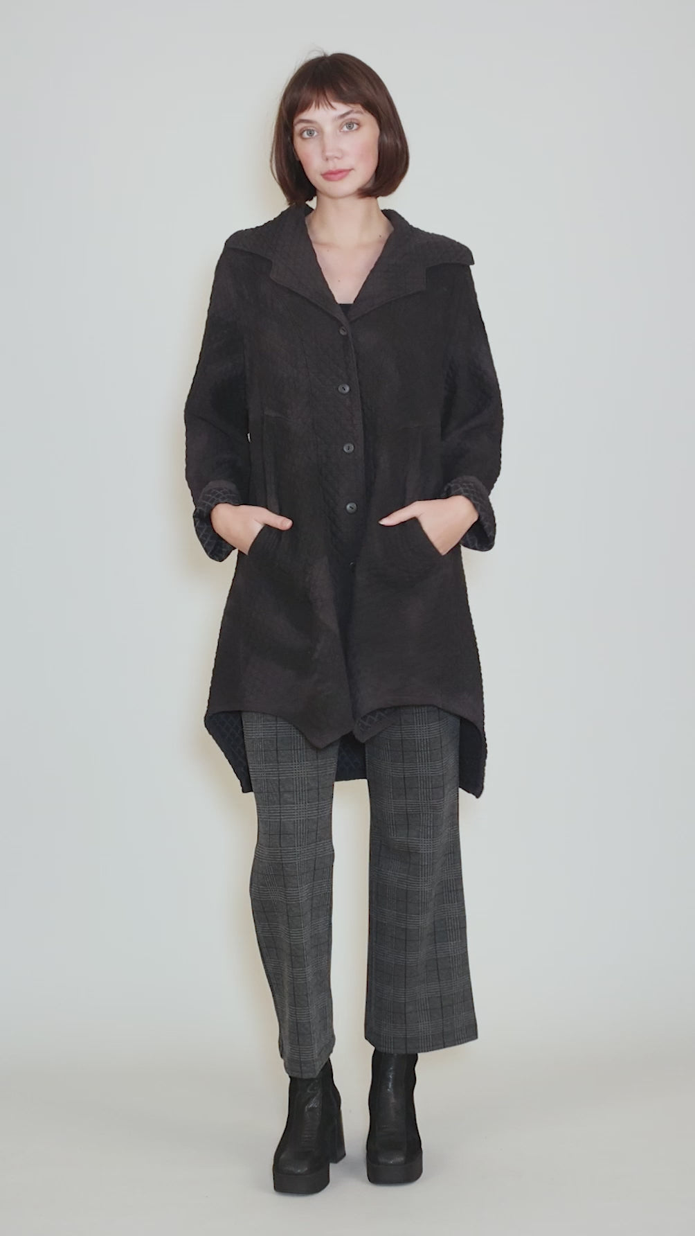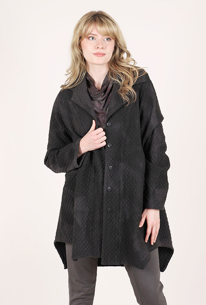 Linus is made in a substantial, quilted cotton, with a button placket in front and a small shirt collar. The silhouette is a true A-line, with slit pockets on the hips, clean lines and a high-low hemline. We find this is running on the large side.