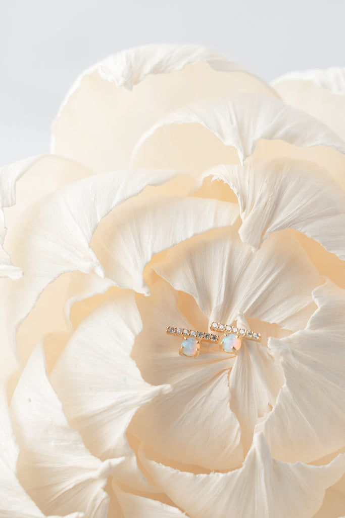 A modern, elegant stud with a hint of ethereal glow. These dainty posts pair a sleek CZ-lined bar with a petite white opal that shimmers softly in the light. Perfect for everyday wear or layered in a curated ear stack, they add a refined, minimalist sparkle without overpowering.