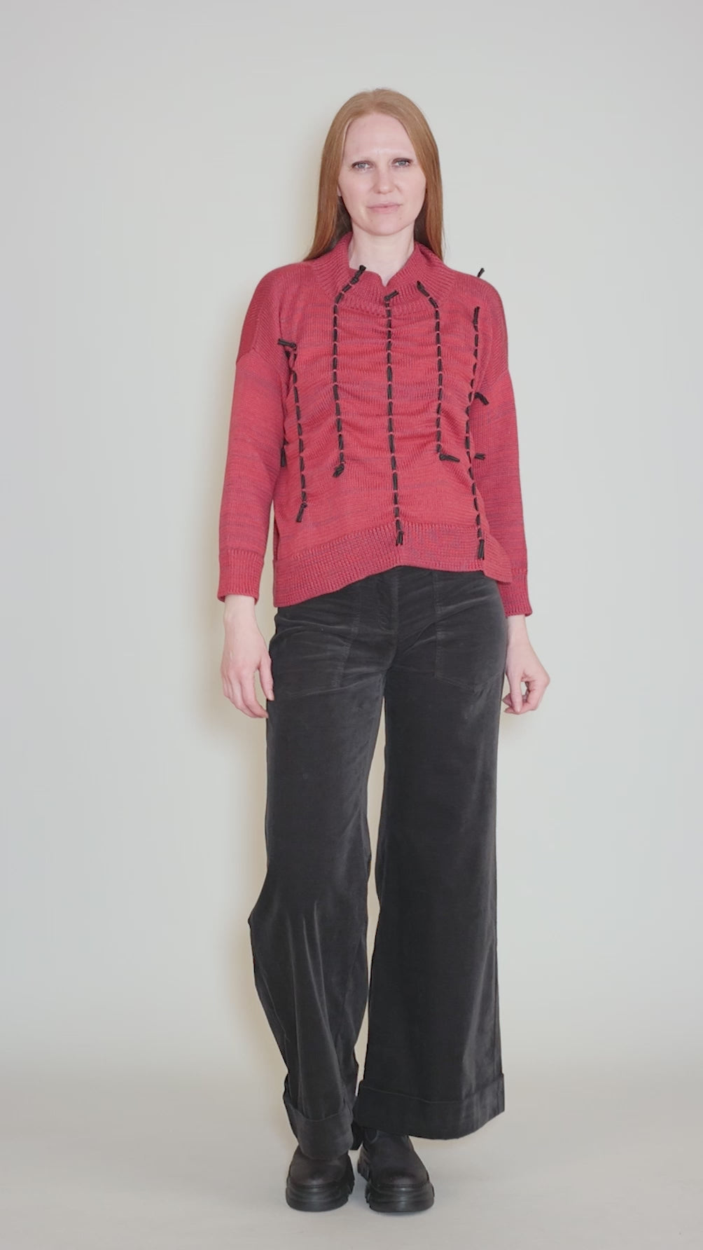 The color is quite lovely here -- more raspberry in our eyes than the 'scarlet' the good folks at Red Thread call it! -- but it's the design that have our in-store customers talking! Dale has a rounded neckline, with a set-in shoulder and bracelet-length sleeves. Contrasting yarn is woven throughout the front, creating a dramatic ruched effect and adding shapeliness to the fit.