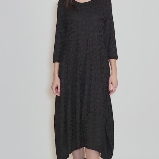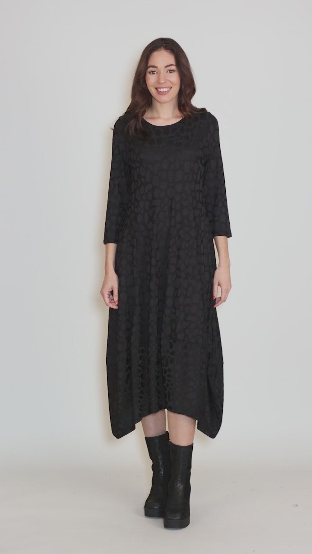 Done in a dimensional poly blend with a subtle sheen, Demi is minimalist charm exemplified. This dress has a rounded neckline, three-quarter-length sleeves and a slim fit through the bodice before falling into a lantern-shaped silhouette and ending below the knee in an asymmetrical hemline. Easy and shapely!