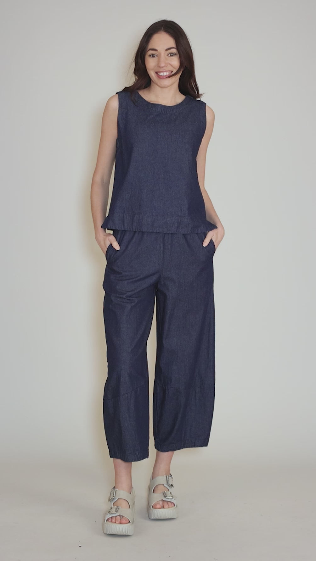 Done in a soft, mid-weight cotton denim, these roomy pants have an elastic waistband, hip pockets and full, lantern-shaped legs that end above the ankle. The fit is relaxed, but the effect is more tailored.