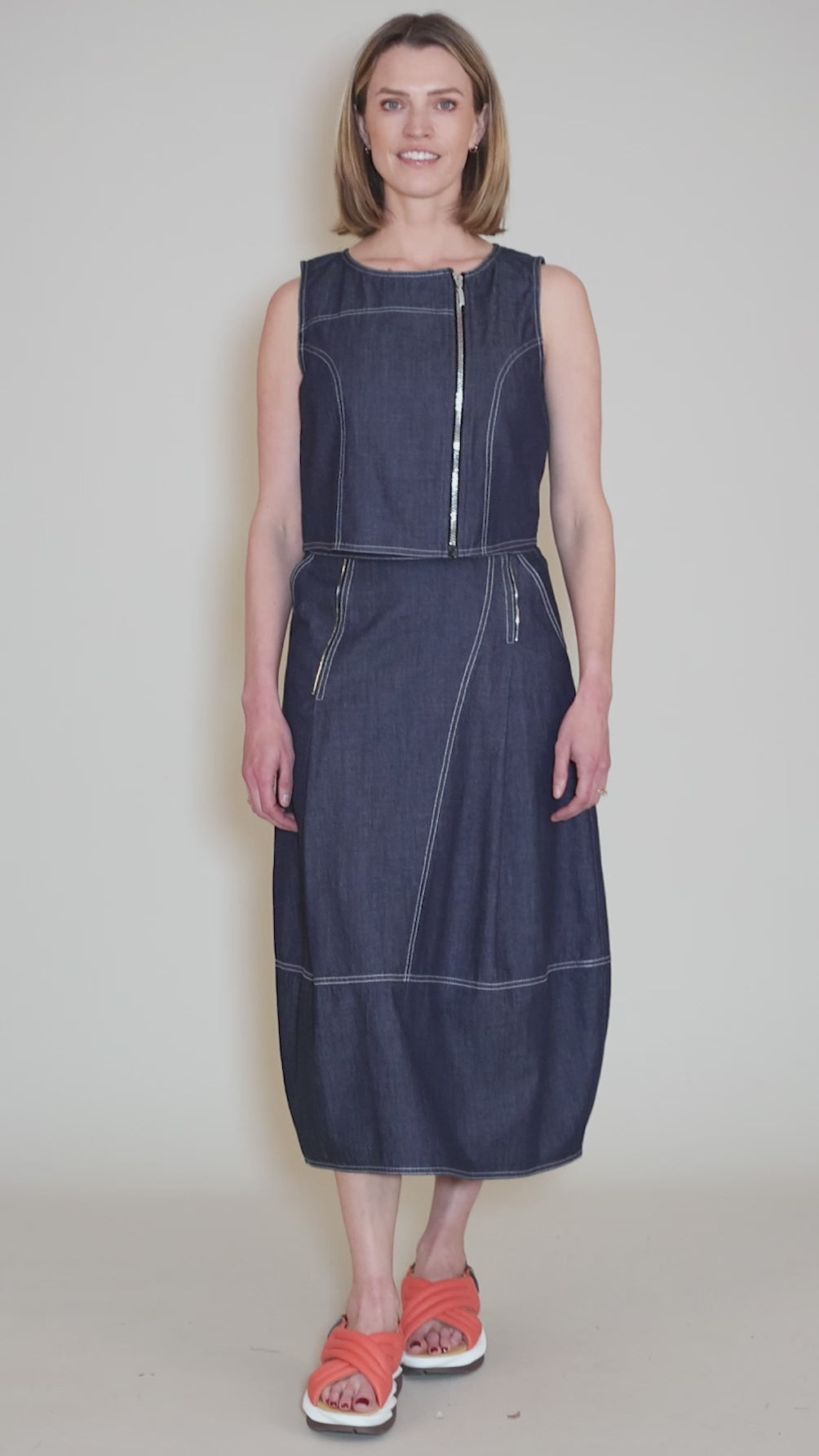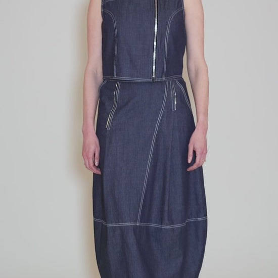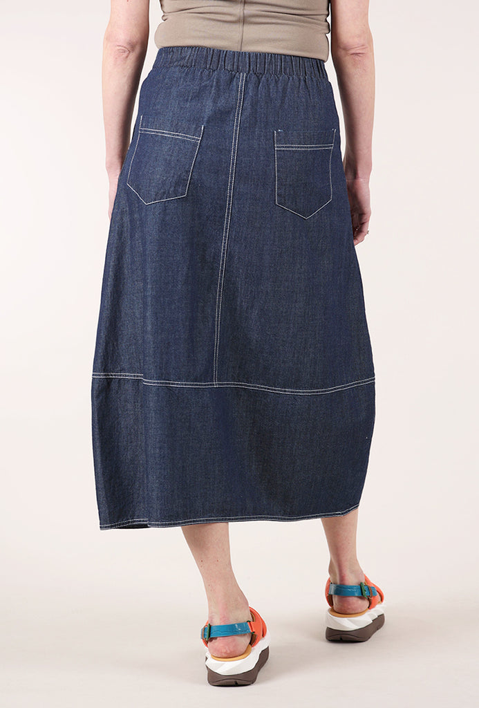Crafted from a lightweight denim that offers movement without sacrificing structure, this skirt features a lantern silhouette that curves gracefully through the leg before tapering slightly to the hem. The design is anchored by a comfortable elastic waistband, ensuring a perfect fit that sits easily on the waist.