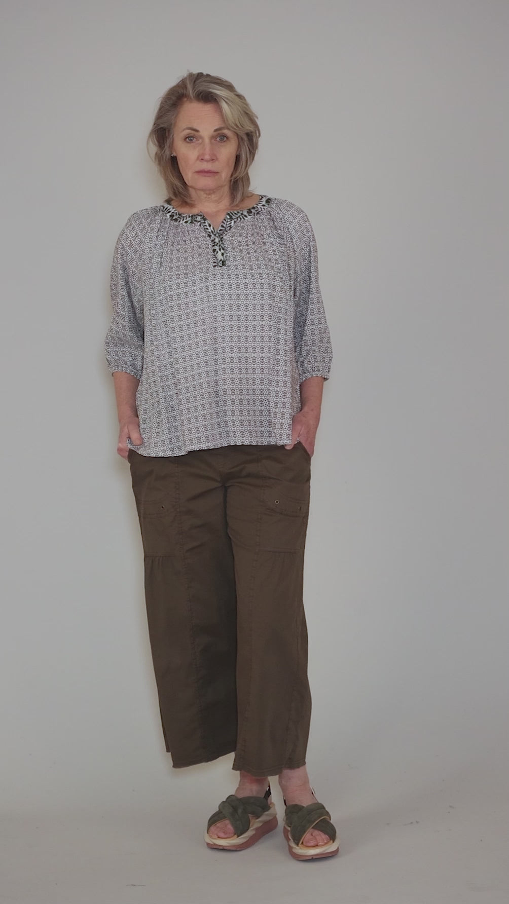 Done in a very lightweight woven viscose, Jewel Geo has light shirring at notched neckline and full, raglan sleeves that end just below the elbow. The body is full and airy, with a slightly rounded hemline.