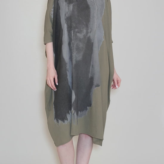 Crafted in a lightweight cotton jersey knit, this oversized dress has a boat neckline, a drop-shoulder construction and three-quarter-length dolman sleeves. The body is a VERY full A-line, with slit pockets on the hips and a cool graphic in front. This is running quite large; we suspect many wearers will opt to size down in it.