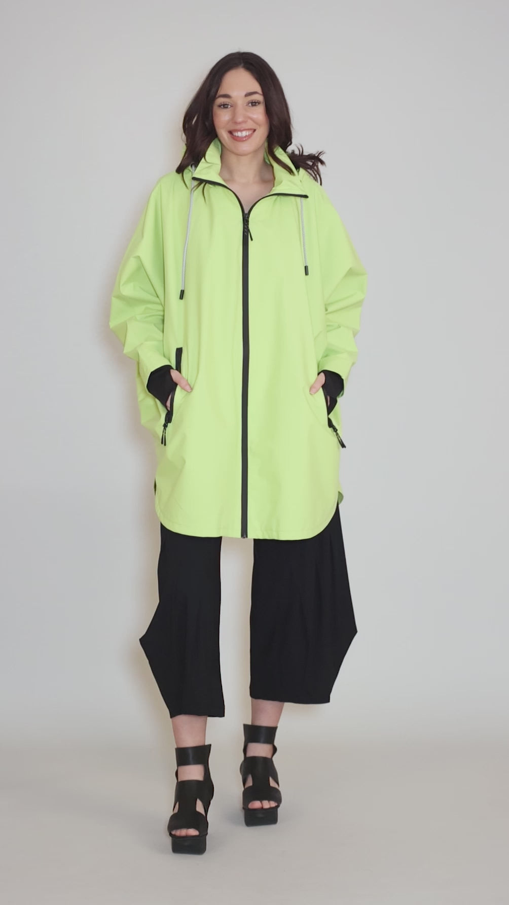 This chic rain jacket has a zipper-front closure, with deep dolman sleeves and a cocoon-shaped silhouette. It's waterproof, with a rounded hemline and an oversized, roomy fit. An oversized hood and stretchy handwarmer cuffs adds to its stylish utility.