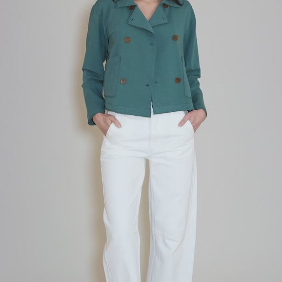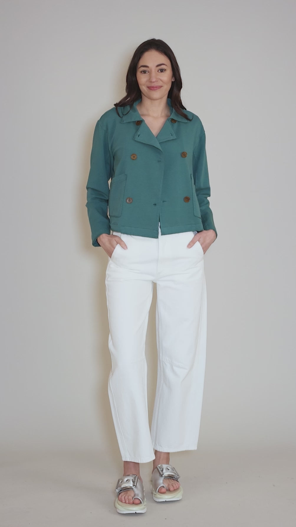The fabric here is so nice, a substantial cotton jersey blend with a smooth texture. The silhouette is a bit cropped, with double-breasted buttons and oversized lapels. The fit is relaxed, but not oversized.