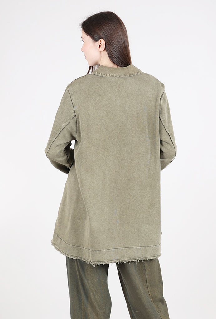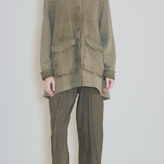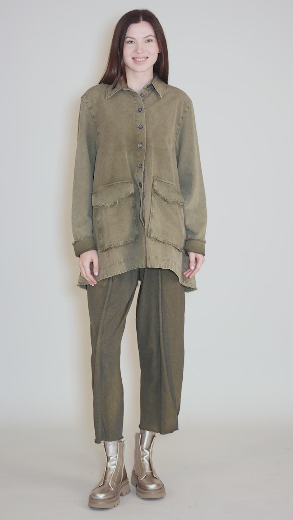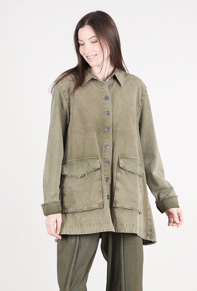 This cool little topper combines a woven cotton front with a comfy sweatshirt-knit back and accent pockets for one lived-in chic look. The jacket has a set-in shoulder, extra-long sleeves and an A-line silhouette. A button-front packet and oversized patch pockets add to the utilitarian vibe.