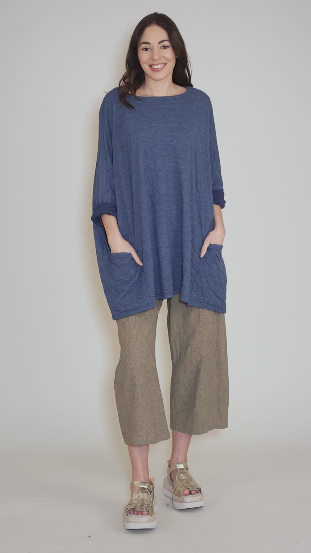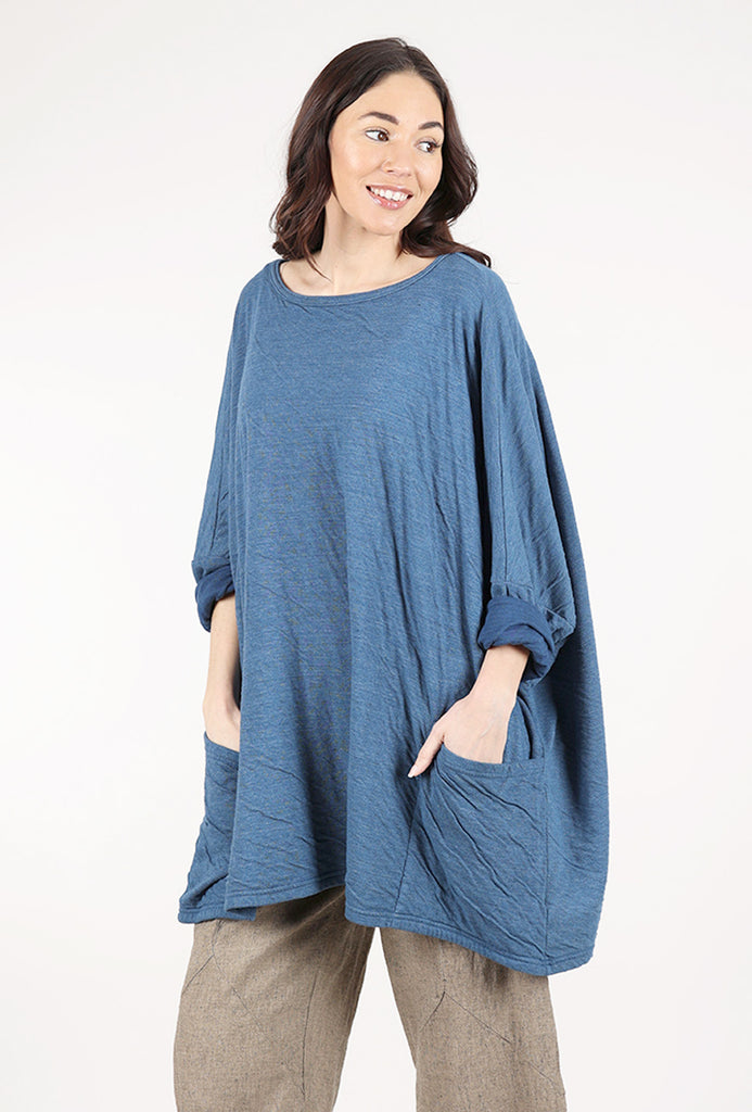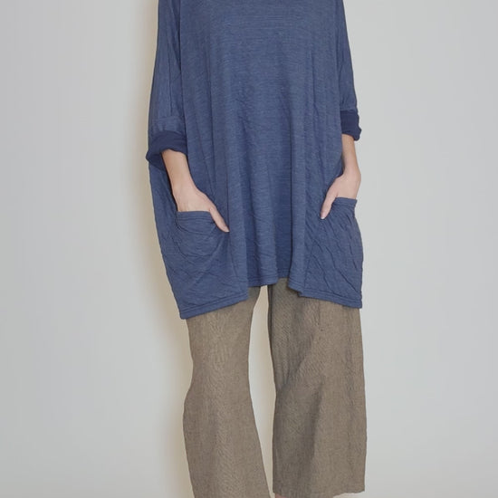 The fabric here is just SO soft! It's made in a double-faced cotton blend that's crinkled on the front of the fabric and smooth on the backside. The top has a rounded neckline, with a drop-shoulder construction and deep three-quarter-length dolman sleeves. The body is deliberately boxy and long; patch pockets sit on the sides.