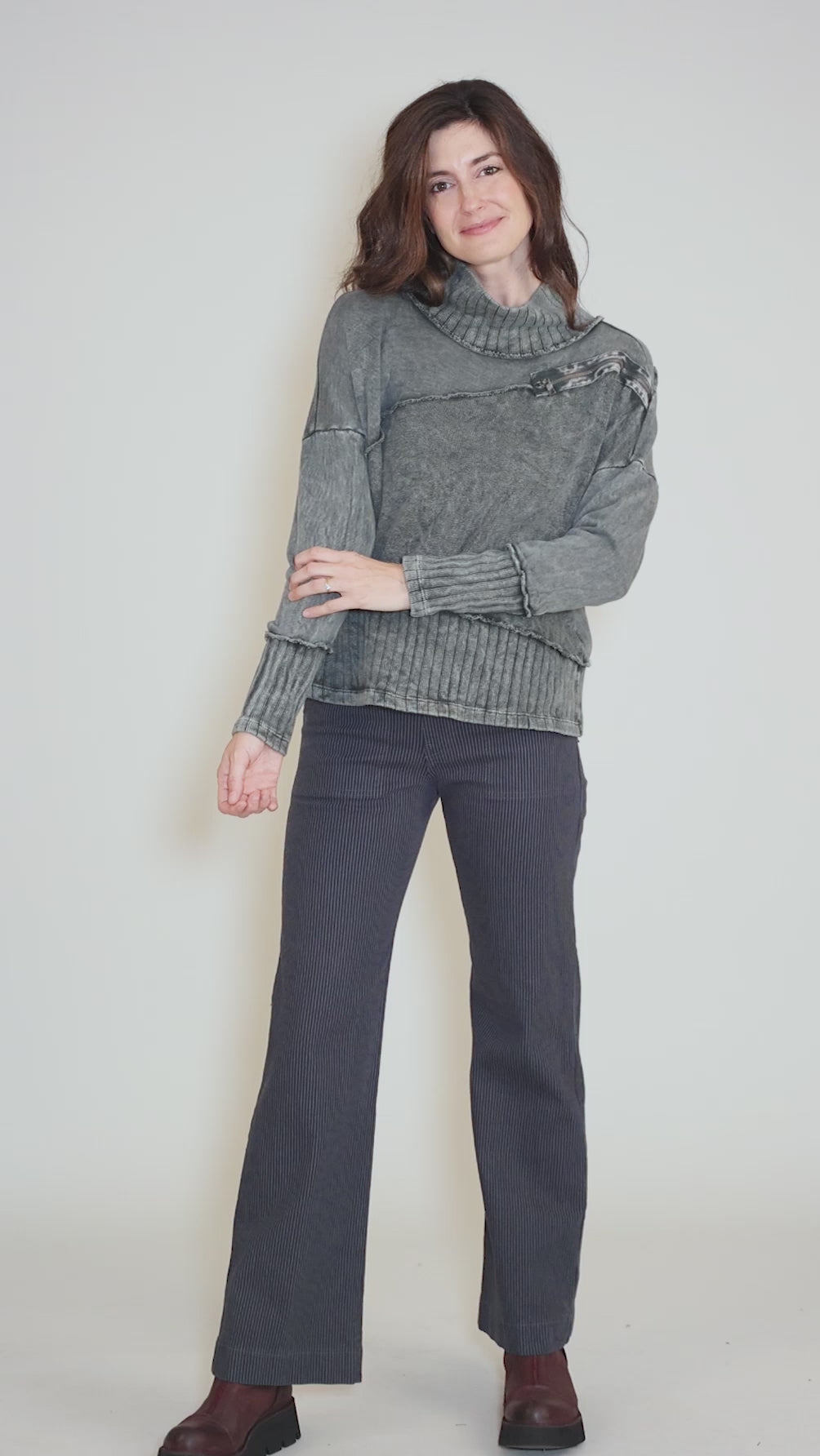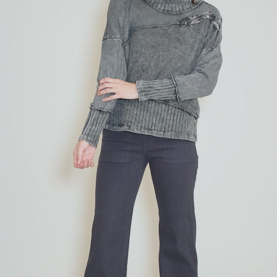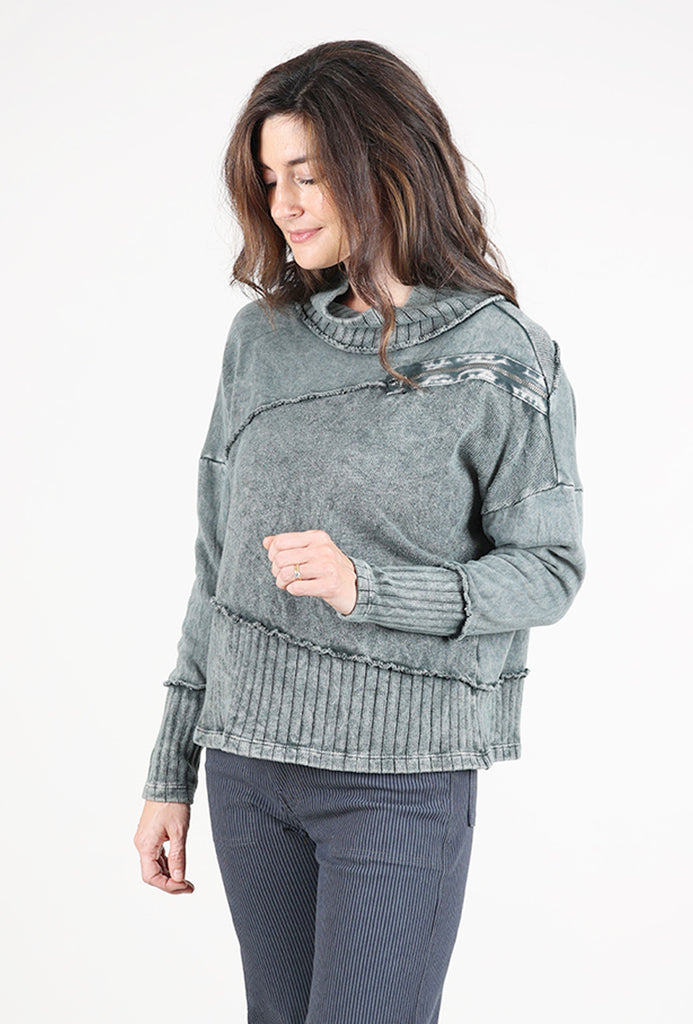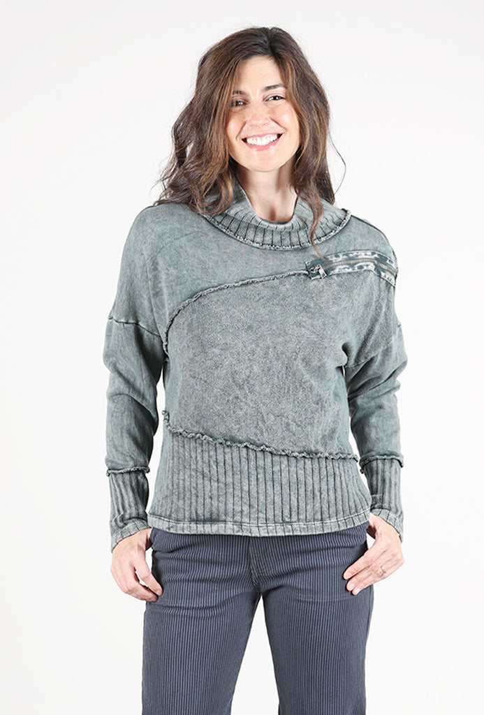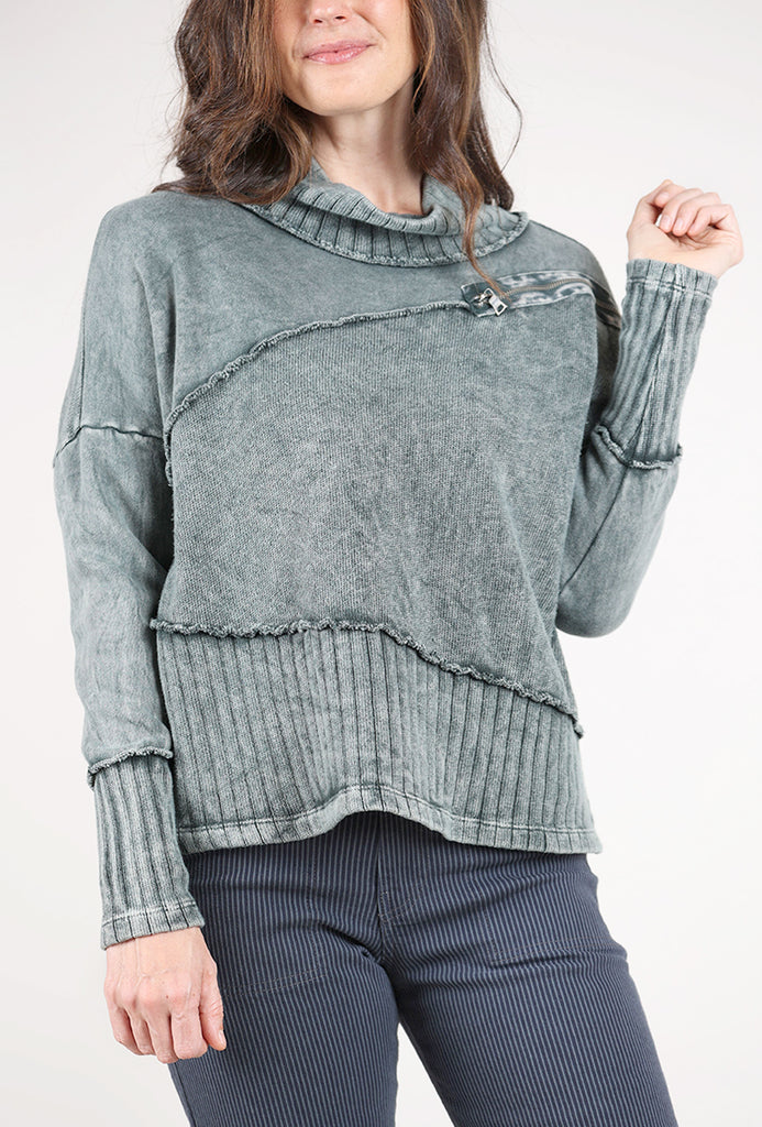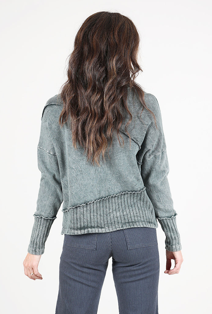 An instant hit with our in-store clients, Elenore is made in a plush sweatshirt fleece that's been garment-dyed for an instantly lived-in look. It has a drop-shoulder construciton with long dolman sleeves and a draped neckline. A contrast knit inset at the hemline and a zipper detail on the check round out Elenore's charms. Running a bit on the large side.
