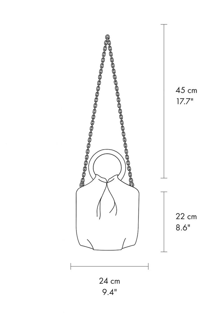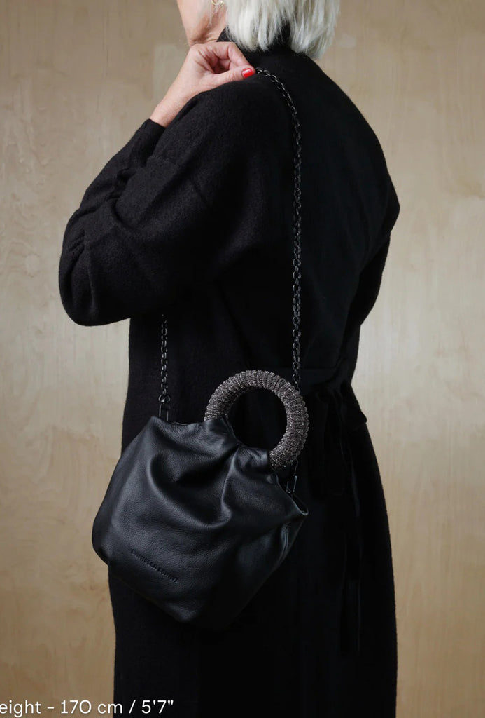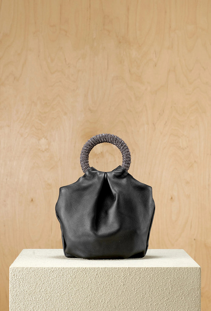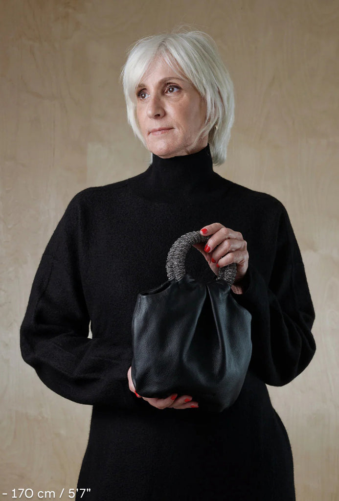 A small, elegant clutch that combines soft leather with a crystal handle, creating an evening-elegant look. The gathered construction around the handle forms an organic, flowing shape that gives the bag a natural and refined presence. It can be worn on the wrist or across the body with its delicate, refined chain strap that blends harmoniously with the overall design.