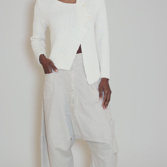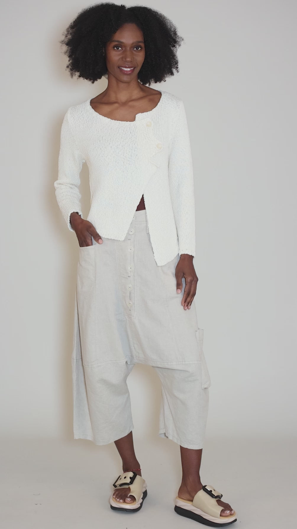 Done in a lightweight cotton-linen blend, these easy pants have a deeply extended rise and a button-front placket, The waistband is flat in front and lightly elasticized in back, and the legs taper near the calf. We find these are running small through the waist, but true to size elsewhere.