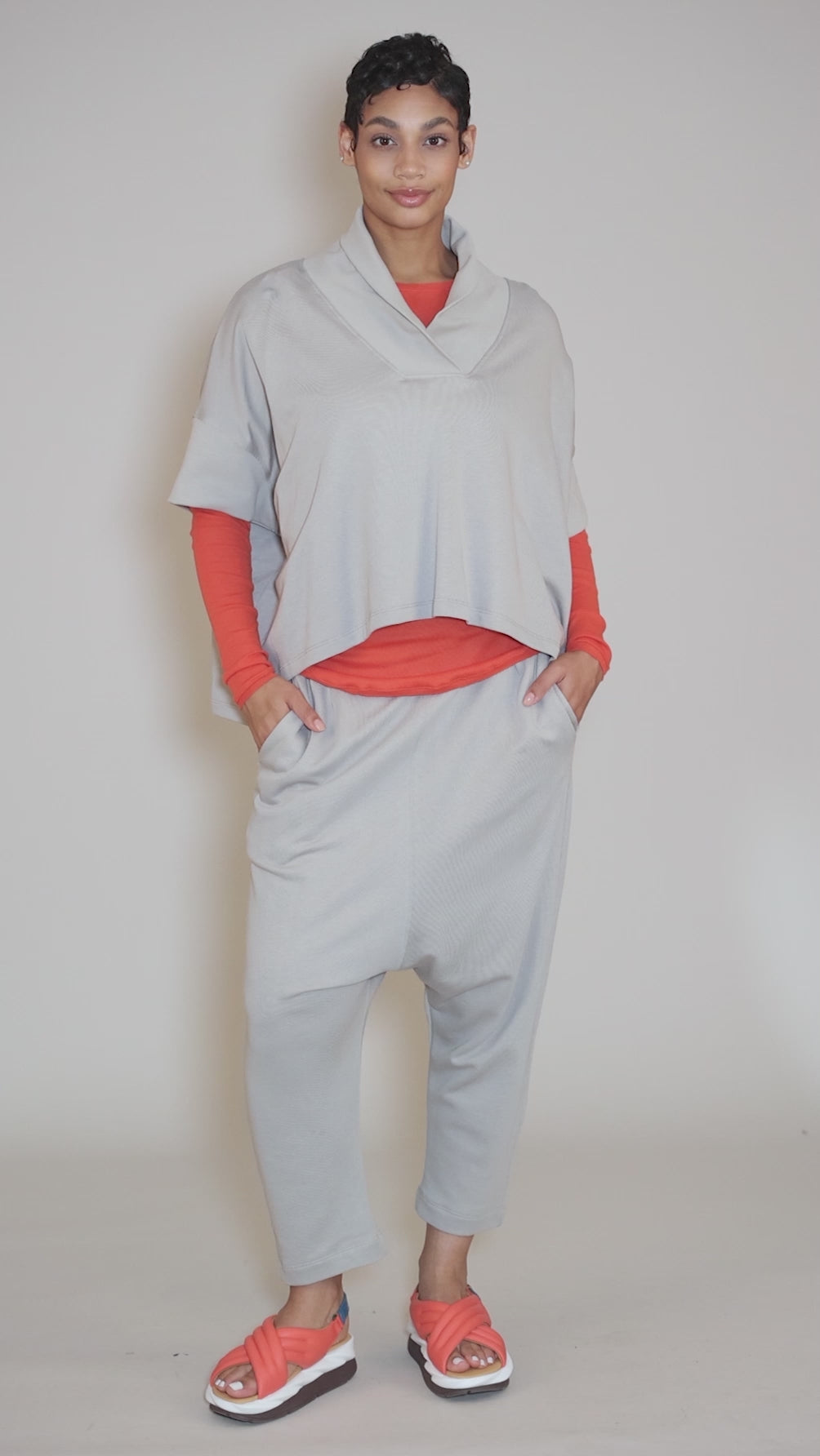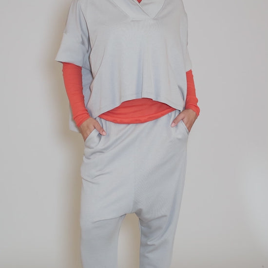 Done in a substantial French terry cotton, these classic drop-crotch pants have a wide, flat waistband, with pockets on the hips and a dramatically extended rise. The leg openings stop just above the ankle, but they are easily pushed up for a more cropped look. The fit is relaxed through the seat and thighs, but the waist runs true to size.