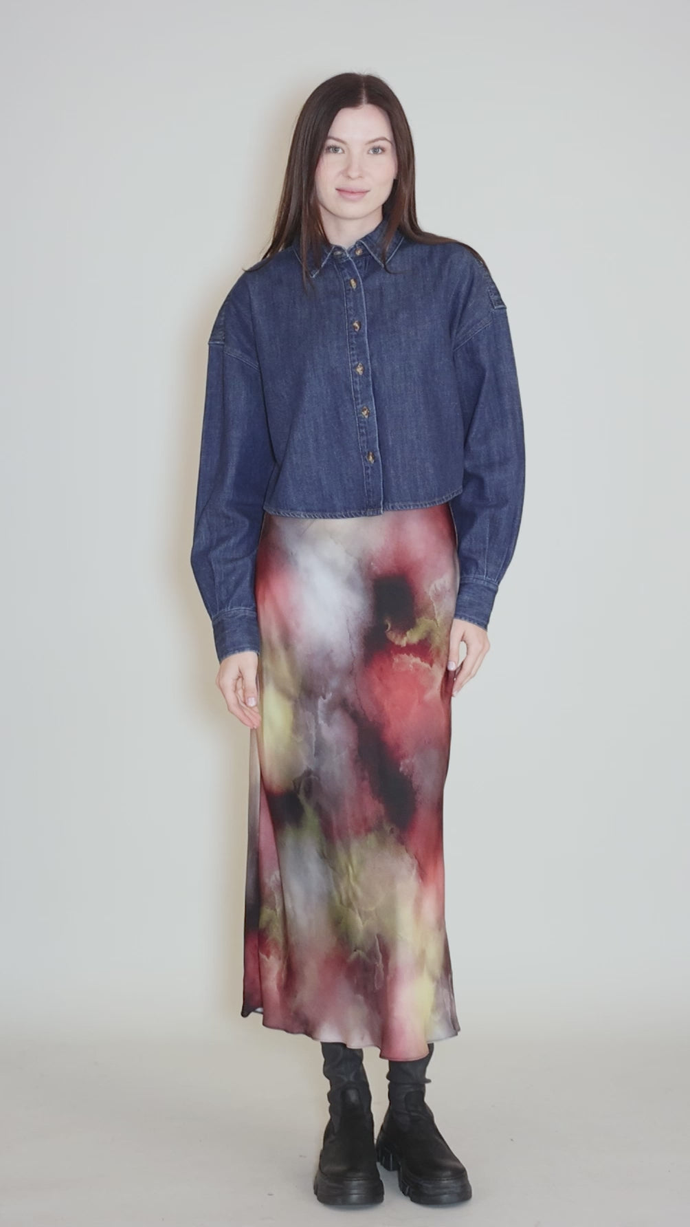 Crafted in a shimmery sateen and cut on the bias, this shapely skirt has a side-zipper closure and a tailored fit. We love the contrast of pairing this silky piece back to chunky sweaters and woolen jackets!