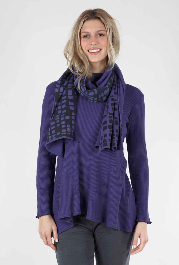 This cozy shawl is done in a lightweight cotton jersey knit. The color combo of cheerful purple and black should certainly work back to all the other neutrals in most of our customers' closets. :)