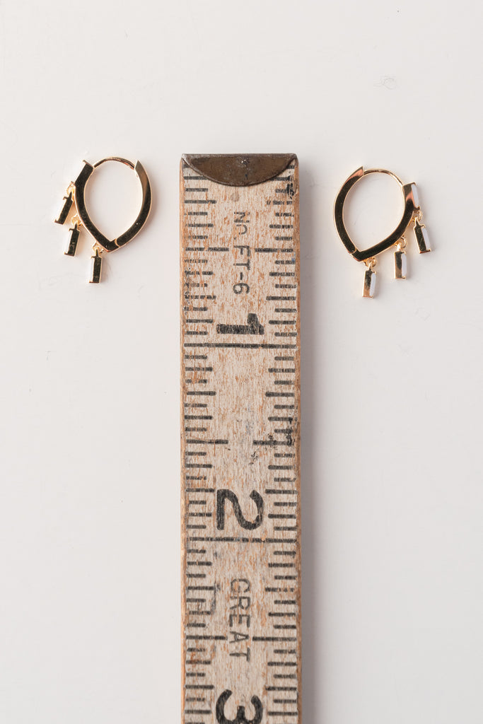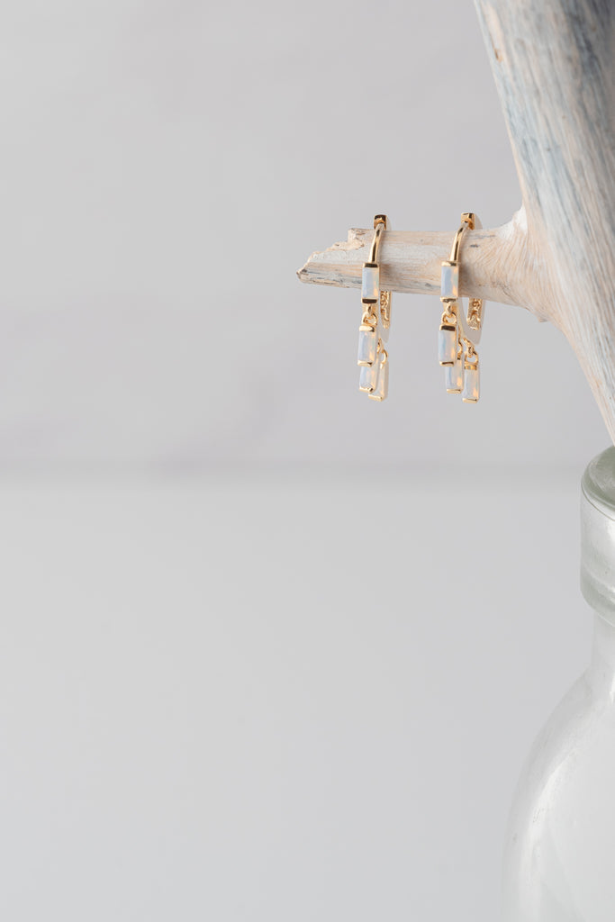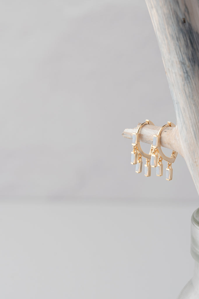 Delicate and eye-catching, these tiny huggies are crafted from 14K gold vermeil and adorned with four dangling baguette-cut cubic zirconia stones. Their subtle movement and refined sparkle make them perfect for everyday wear or as a chic addition to your ear stack.