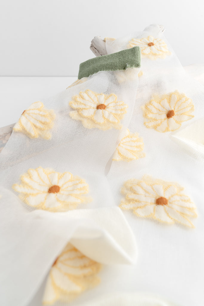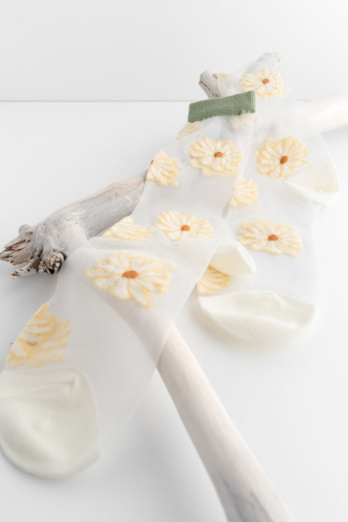 Like a tiny spring bouquet, with a soft green finish. These sheer socks feature raised floral details across a translucent base, finished with a muted green cuff and creamy heel and toe. Lightweight and sweet, they add just enough charm to sneakers, loafers, and Mary Janes without feeling fussy.