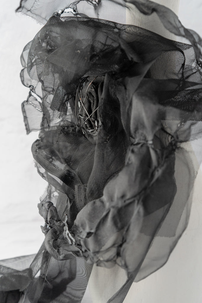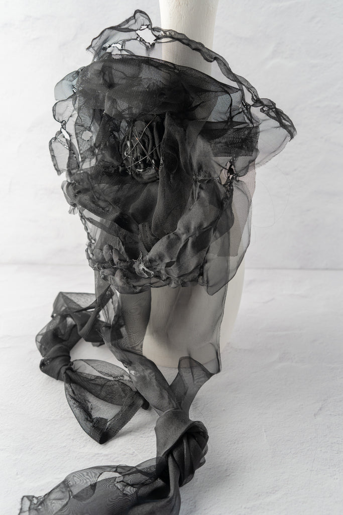 Evoking the poetry of imperfection, this avant-garde flower pin by Sanctamuerte fuses fragility and strength in a single statement piece. Crafted in Italy from layered black textiles, the design features raw edges and distinct burn details that lend an air of elegant decay. The distressed, sculptural form transforms fabric into something both organic and otherworldly, a dark bloom that dares to stand apart.
