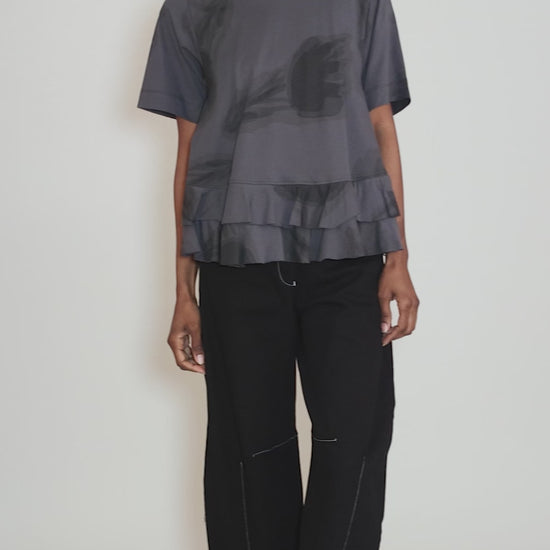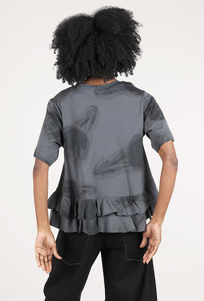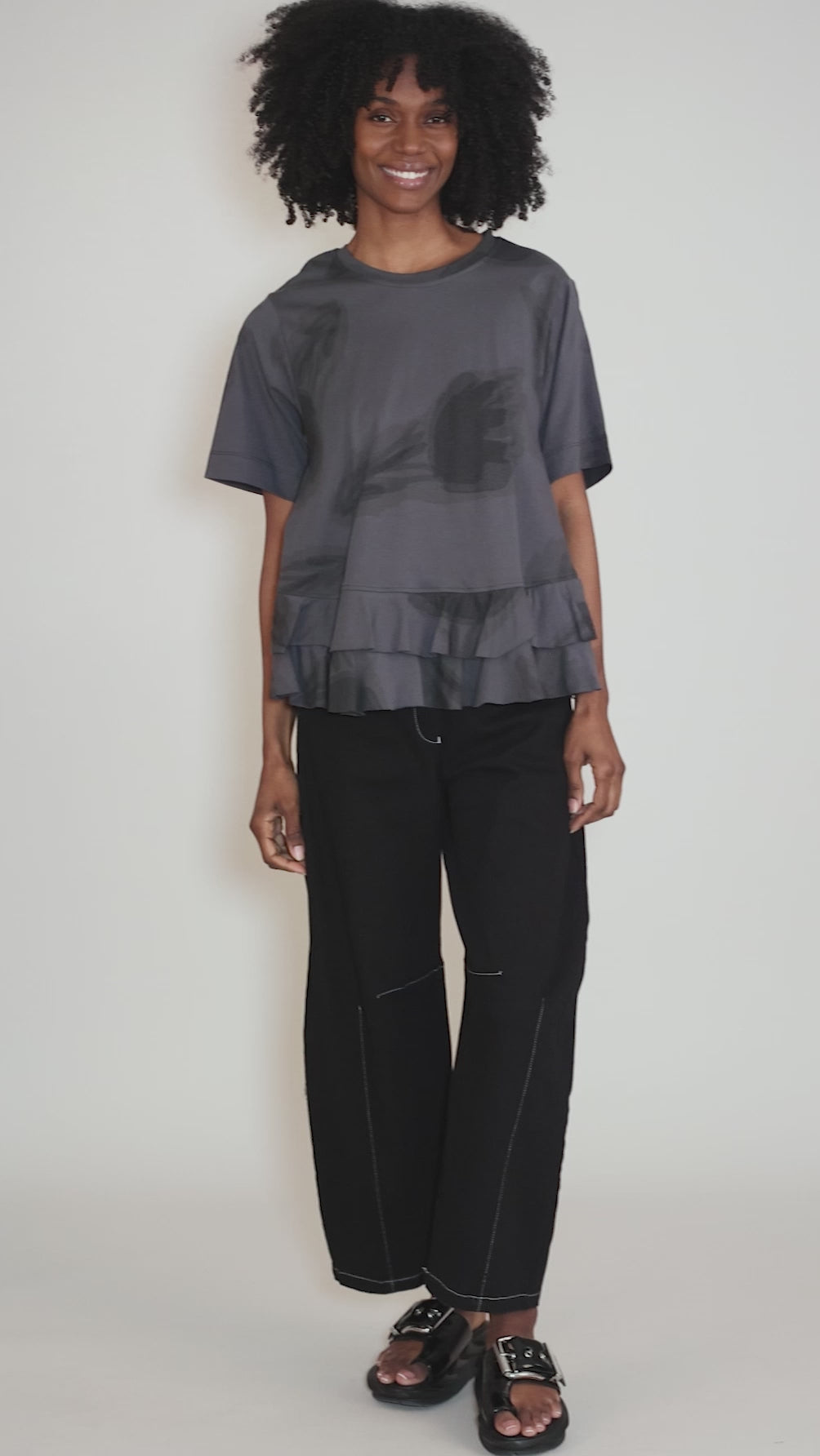 Made in a soft cotton jersey, the Fogflower tee is quite well named! It has a rounded neckline, short sleeves and a full, A-line silhouette that ends in a double flounce at the hemline. The fit is relaxed., and we love its faint floral print.