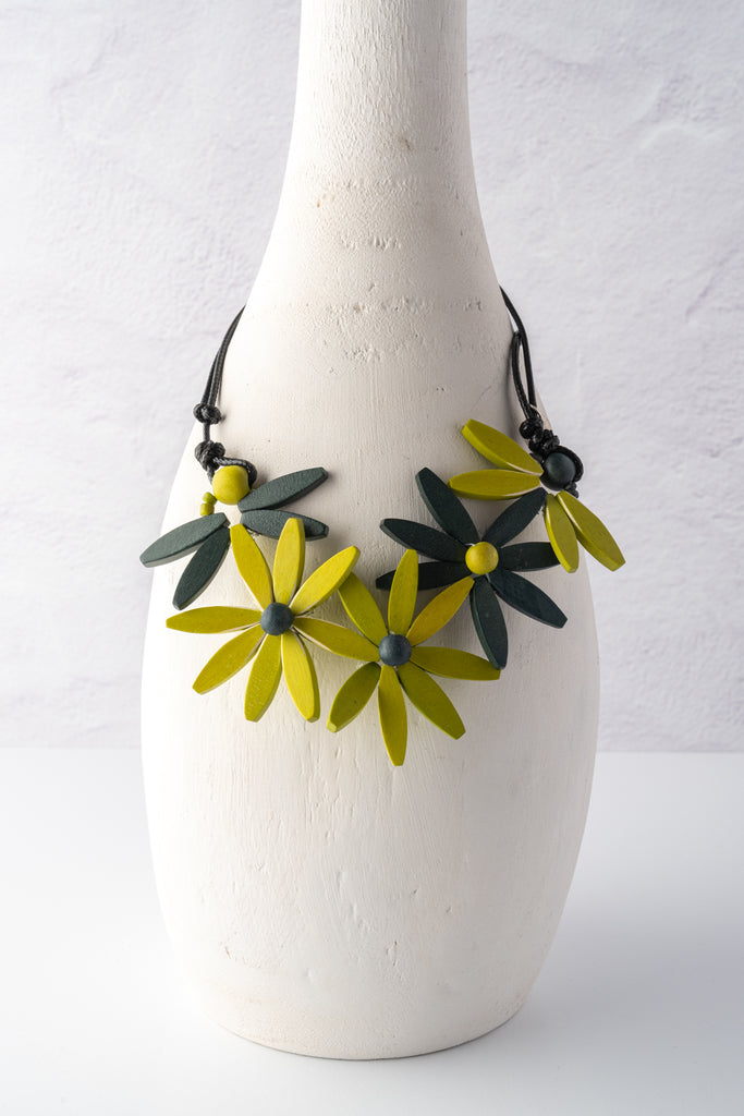 The Lime Garland Nectar Statement Necklace is a graceful celebration of nature-inspired design and artisan craftsmanship. Five delicate flowers in vibrant lime, charcoal, and white wood tones form an elegant wreath that brings botanical beauty and fresh sophistication to any look. Hand-strung on an adjustable wax cord, this lightweight statement piece offers both comfort and versatile elegance that transitions effortlessly from day to night.