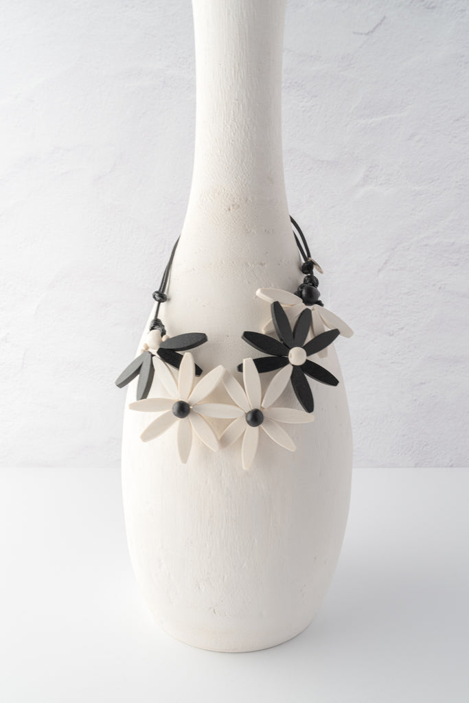The White Garland Nectar Statement Necklace is a graceful celebration of nature-inspired design and artisan craftsmanship. Five delicate flowers in serene white and black wood tones form an elegant wreath that brings botanical beauty and timeless sophistication to any look. Hand-strung on an adjustable wax cord, this lightweight statement piece offers both comfort and versatile elegance that transitions effortlessly from day to night.