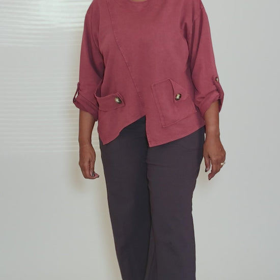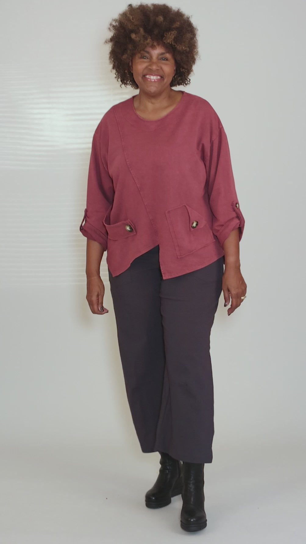 How cute is this little top? It's made in a lightweight cotton sweatshirt knit, with a rounded neckline and a drop-shoulder construction; the dolman sleeves are three-quarters in length. The silhouette is a relaxed A-line, with mismatched hip pockets to emphasize the uneven hemline.