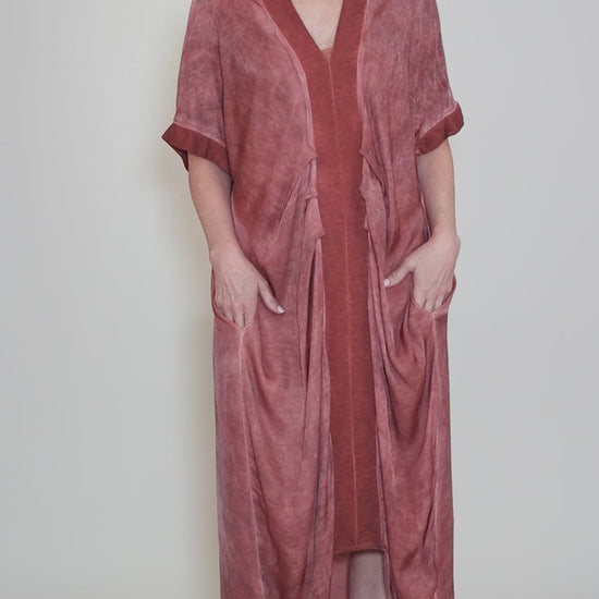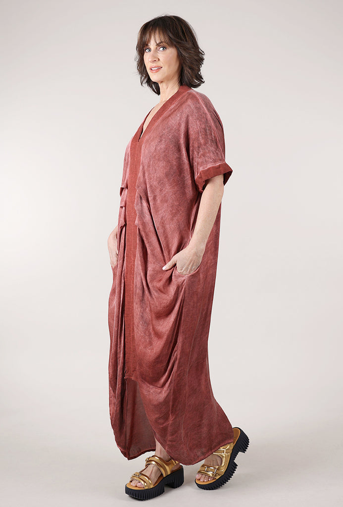 In a word, gorgeous! Crafted in a sensuous viscose-silk blend, this romantic dress has a V neckline, elbow-length sleeves and a very full, A-line silhouette. A contrast panel down the front sets up subtle ruching, along with a high-low hemline. Slit pockets sit on the hips. We find this is running on the large side.