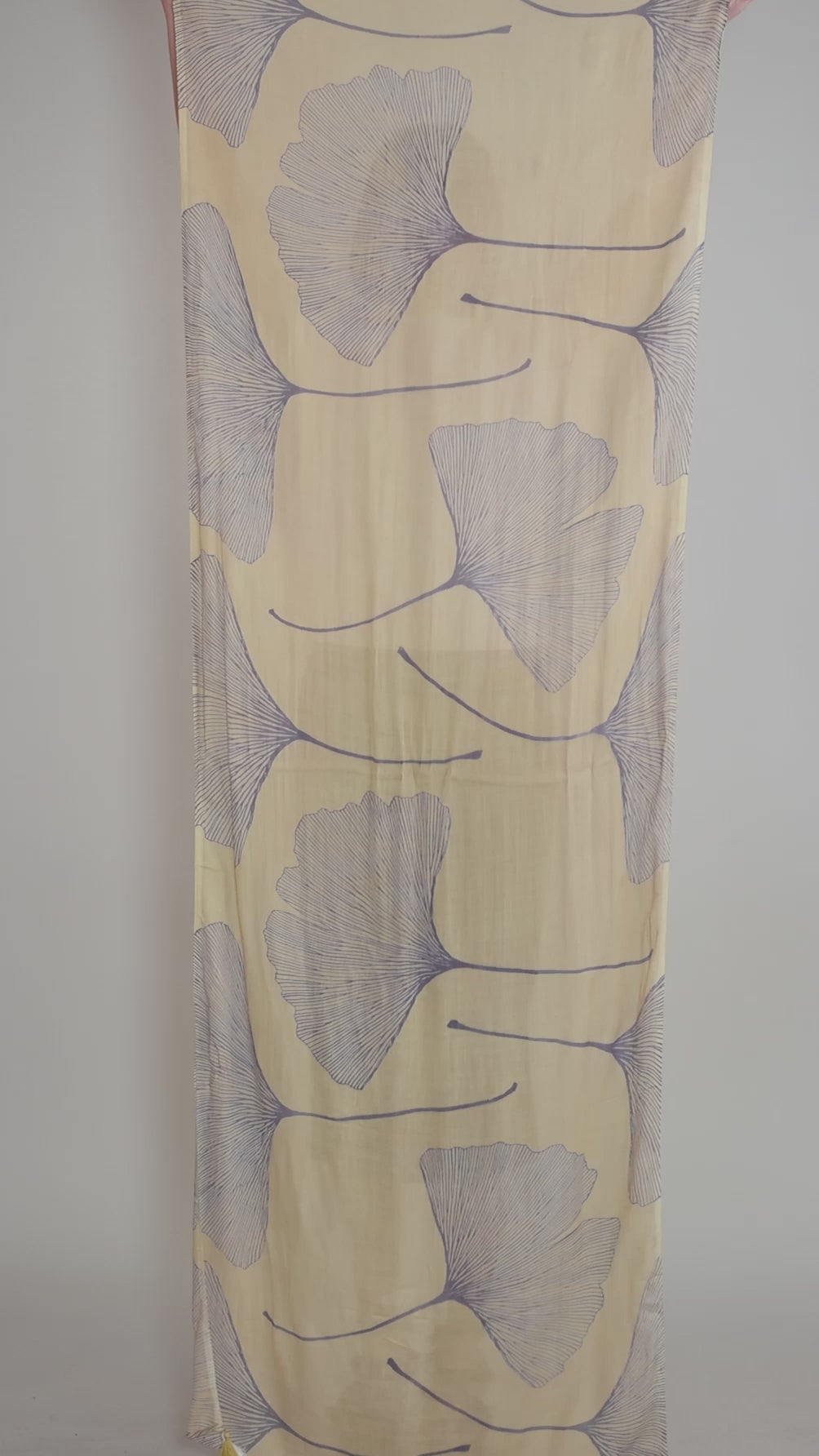 Welcome warmer weather with this lightweight and versatile scarf. The large ginkgo print offers a modern, graphic look, all on a handwoven viscose with excellent drape. Double tassels dangle from the four corners.