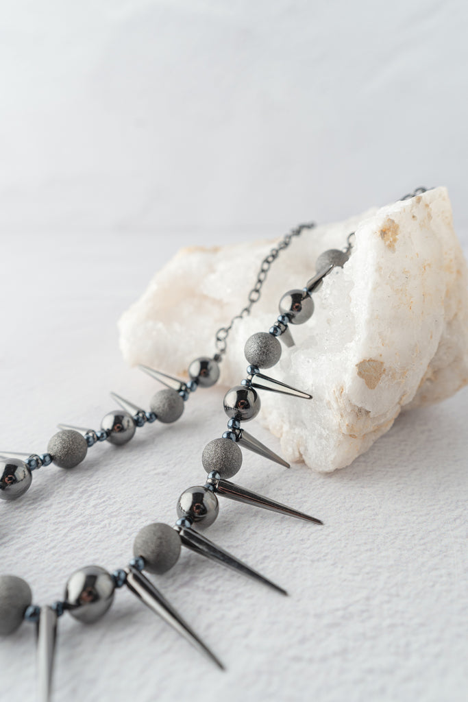 Edgy and modern, the Greg Necklace brings bold attitude to any look. Alternating matte and glossy hematite beads are accented by sleek metallic spikes, creating a striking balance of texture and shine. Finished with a dark gunmetal chain, this statement piece adds a cool, confident edge to your ensemble.