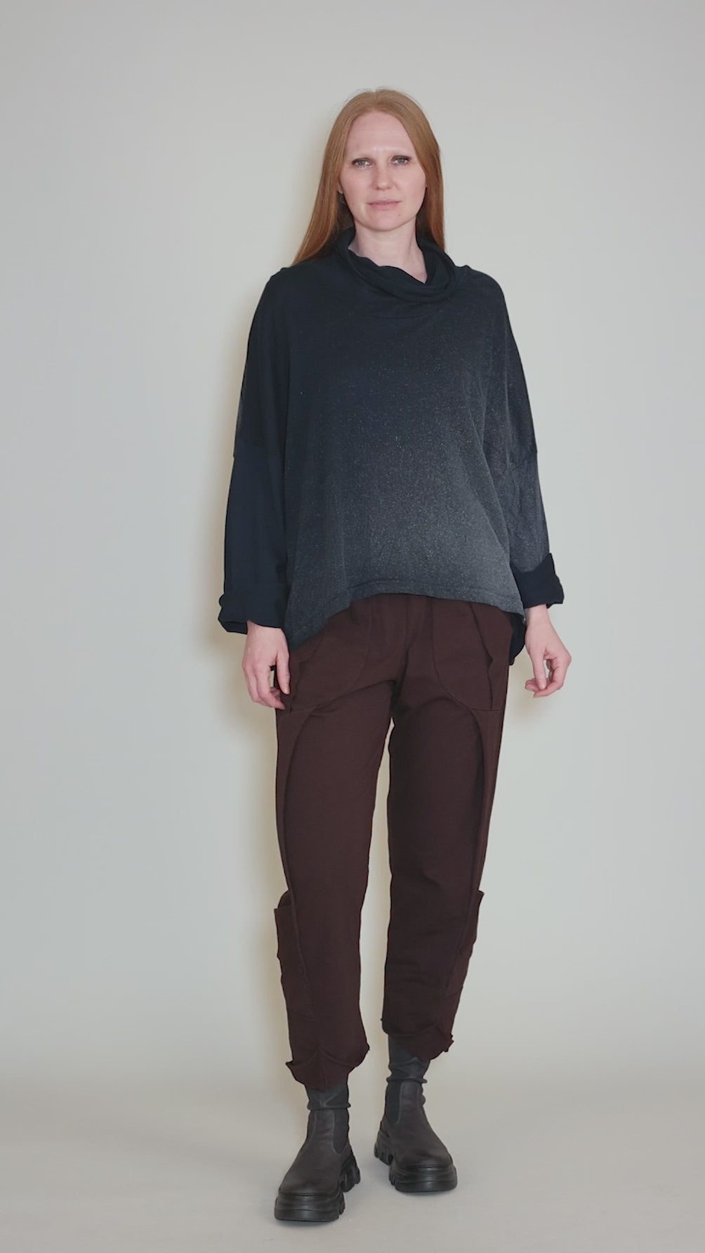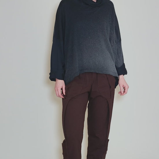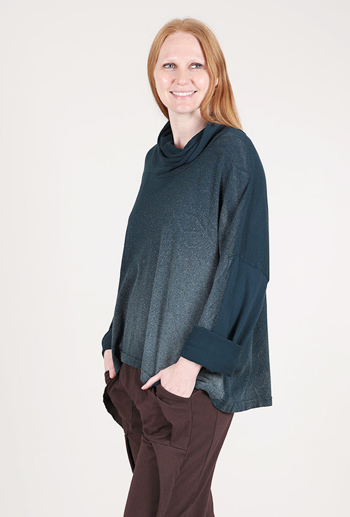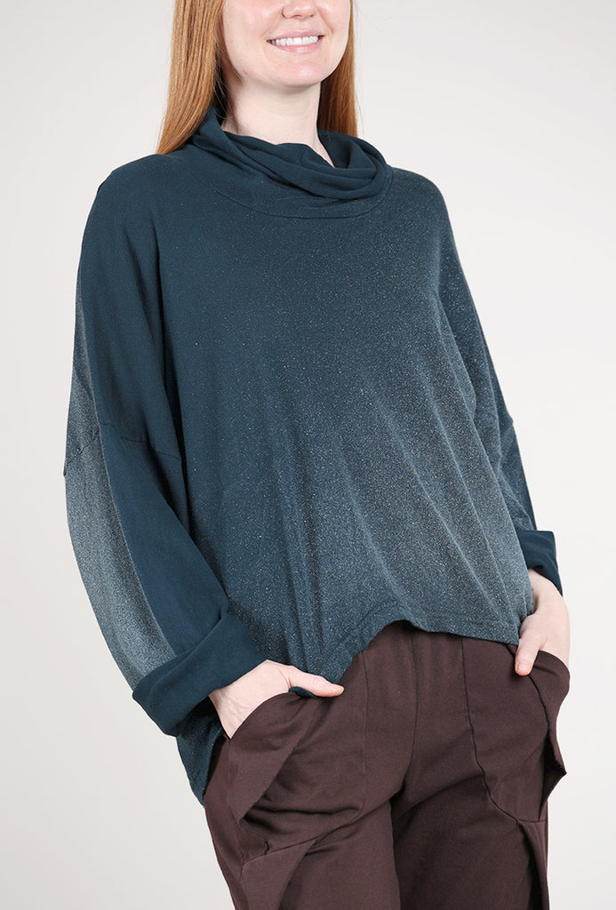Made in a lightweight cotton sweater knit, Grotto has a cowl neckline, with a drop-shoulder construction, extra-long sleeves that can be turned over at the wrist and a full, A-line silhouette. The color here is so moody and rich, a deep shade of teal that's been hand-painted on top in shades of shimmering silver.