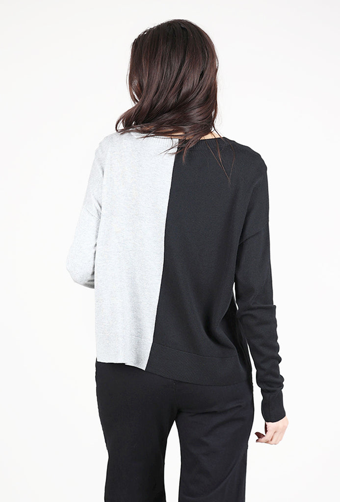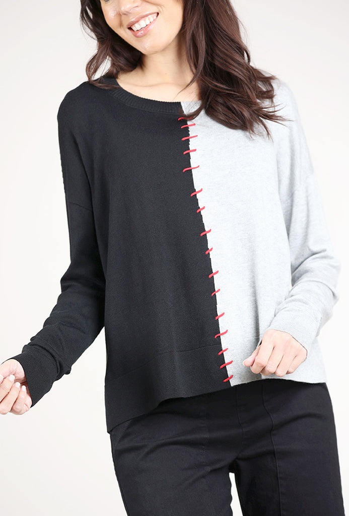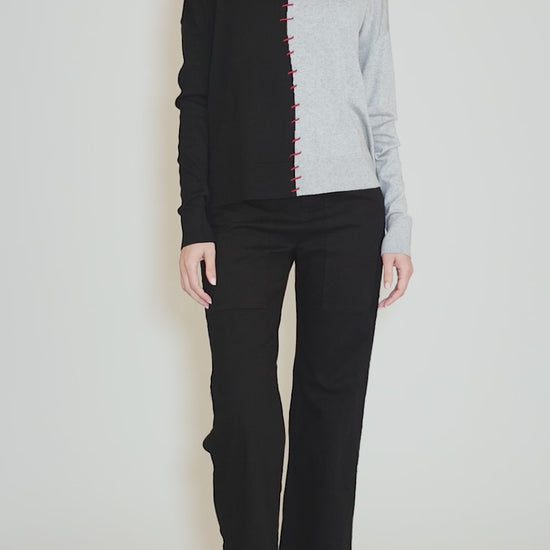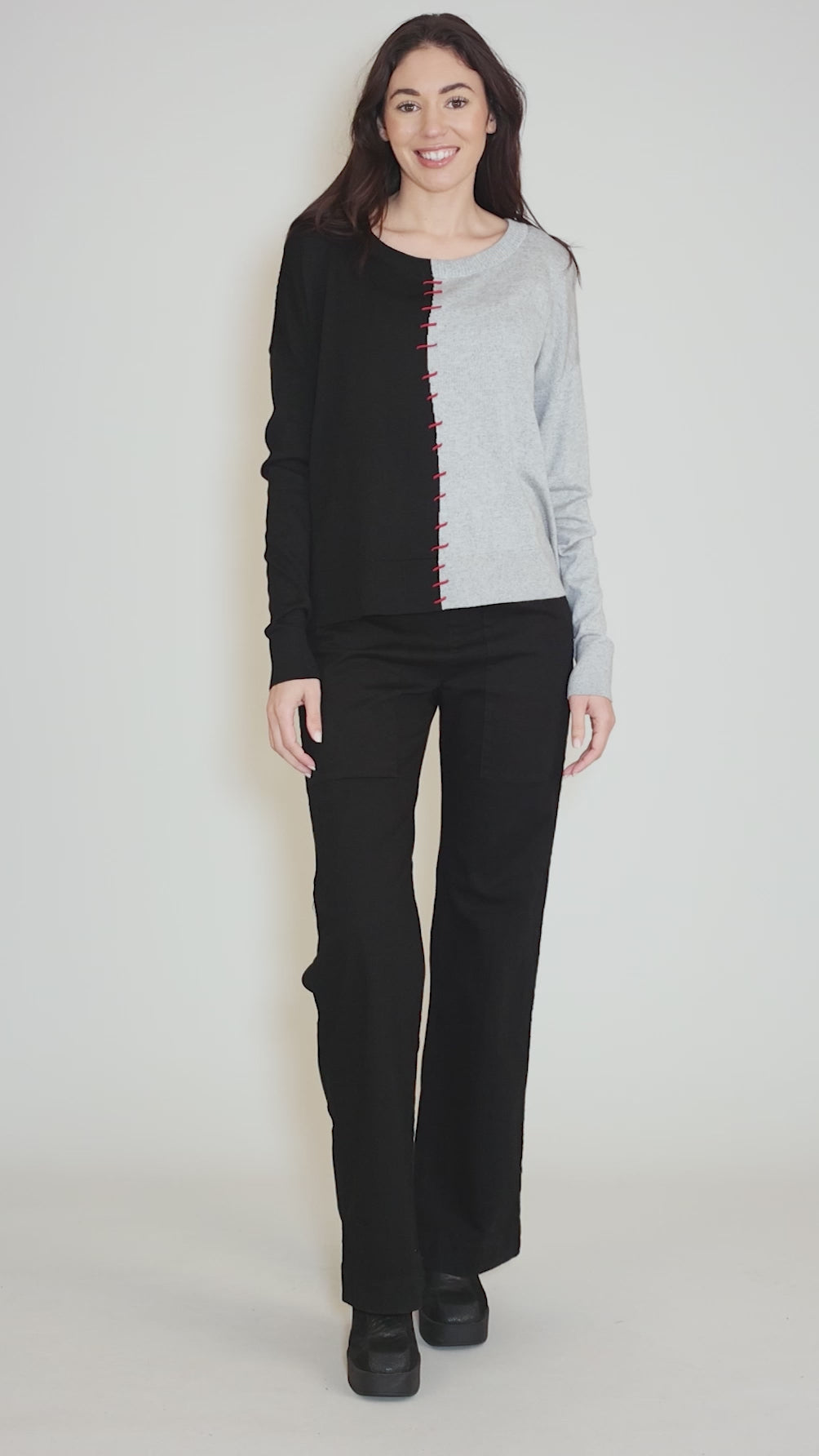 So soft! Knit in a sumptuous, lightweight cotton-Modal blend, this playful little sweater has a rounded neckline, with a drop-shoulder construction and extra-long sleeves. It is color blocked on each side, with a contrast whipstitch detail down the center in bright red, which gives the sweater its name.