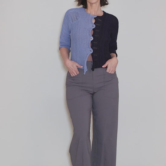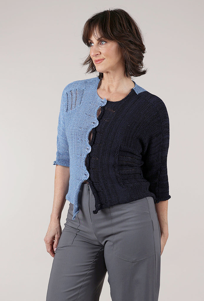 Hand-knit in a mid-weight cotton, this cute cardie has a rounded neckline and elbow-length sleeves The silhouette is slightly cropped and deliberately boxy, with a button-front placket and drop-stitched detailing throughout.