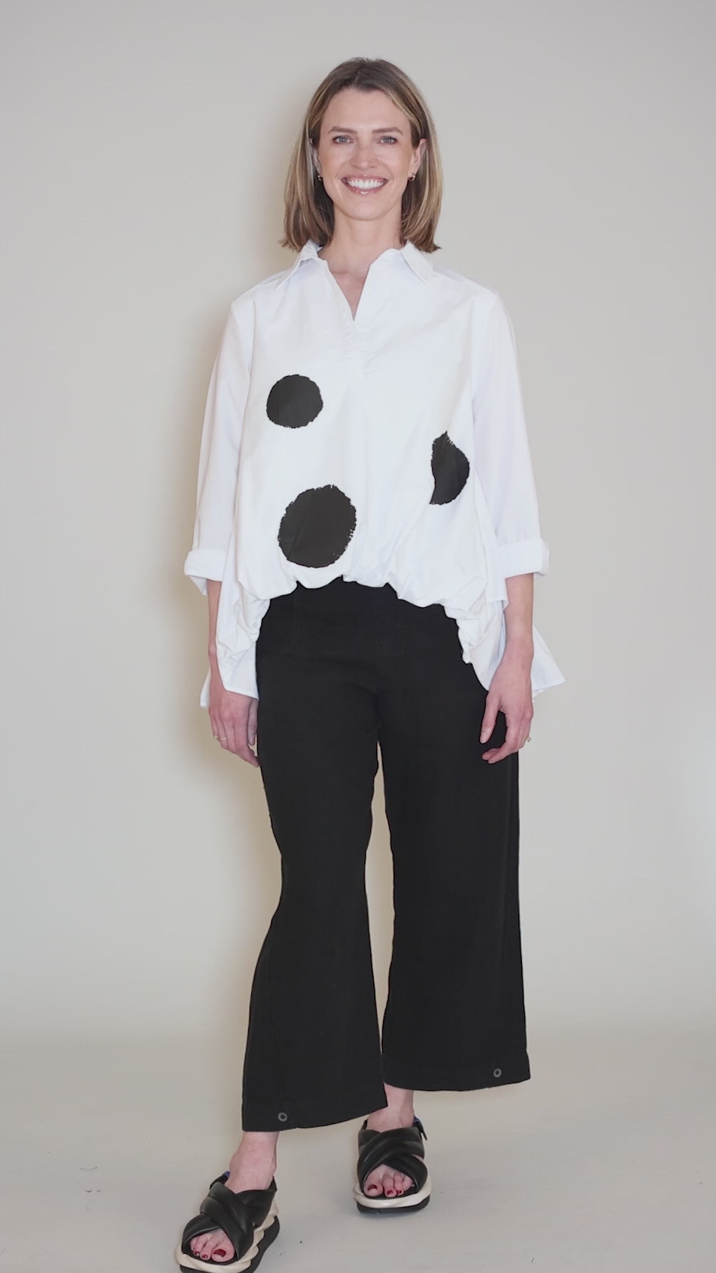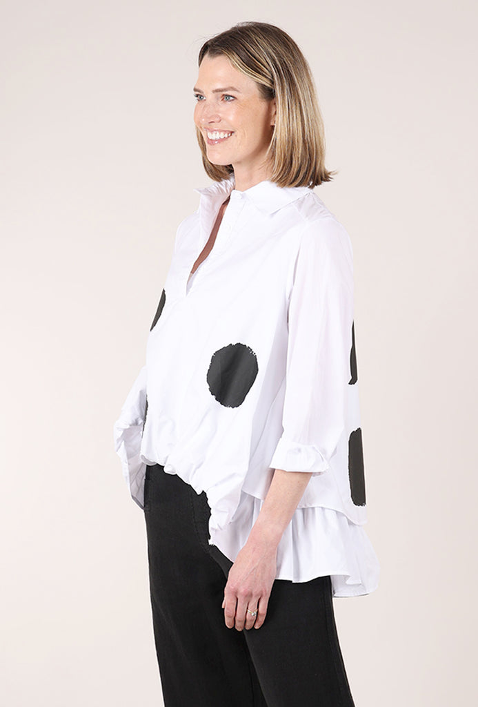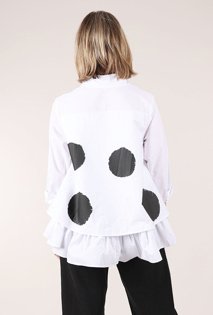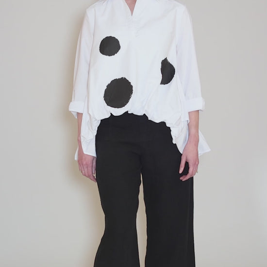 Made in a crisp cotton poplin blend, this artful top from Vanite Couture has a set-in shoulder, long sleeves and a half-button placket in front. The hemline is dramatically high low, tucked under in front, which sets up a sweeping, double-layered back view.