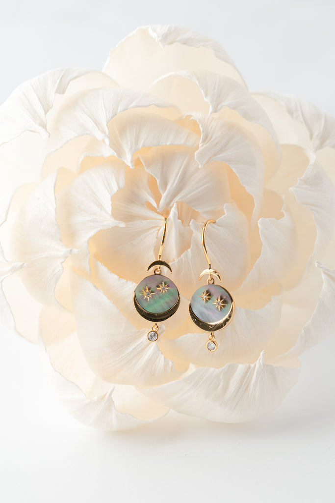 Softly luminous and beautifully detailed, these inlay drop earrings bring a dreamy celestial touch to any look. Each earring features a round mother-of-pearl inlay framed in gold, accented with two tiny starbursts that catch the light with every movement. A petite bezel-set cubic zirconia drop adds just a touch of sparkle, creating a delicate sway that feels both feminine and refined.