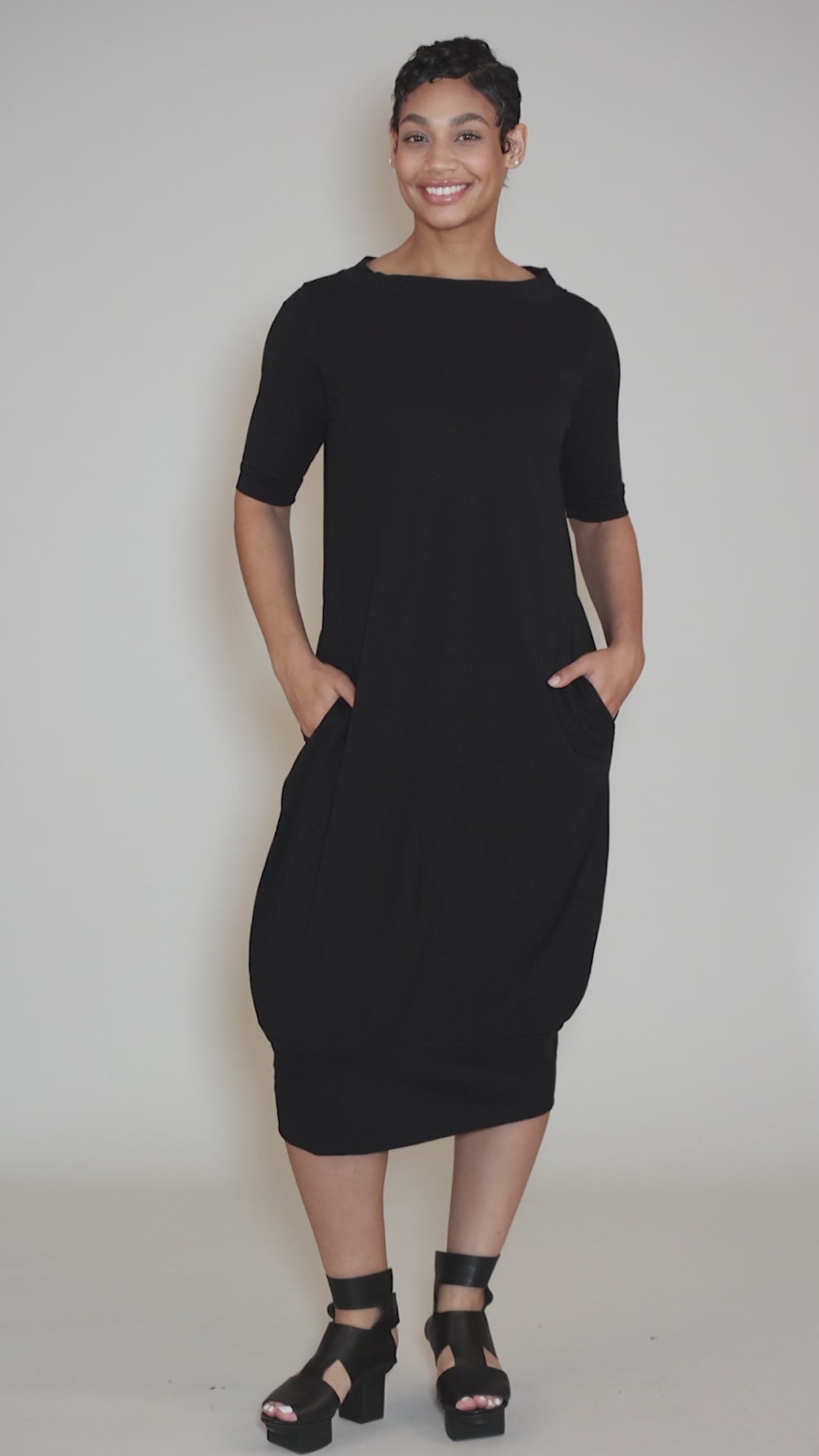 Made in a smooth cotton jersey knit, this easily elegant dress has a bateau neckline, with a set-in shoulder and elbow-length sleeves. The silhouette is trim, but not too body conscious; a twist detail between the shoulder blades adds subtle shaping, as does the banded hemline. Running true to size.