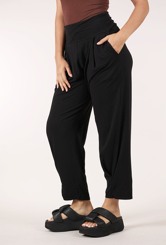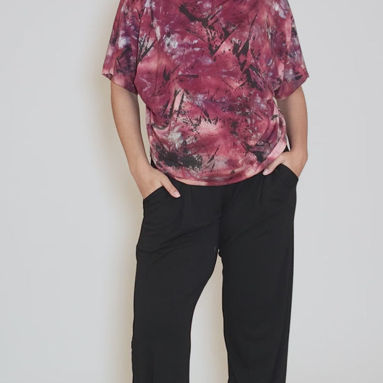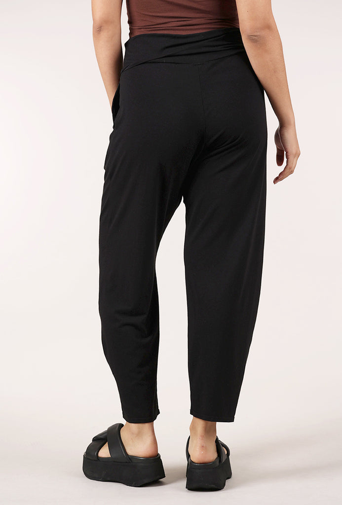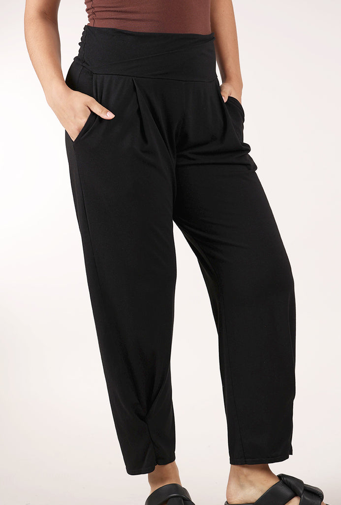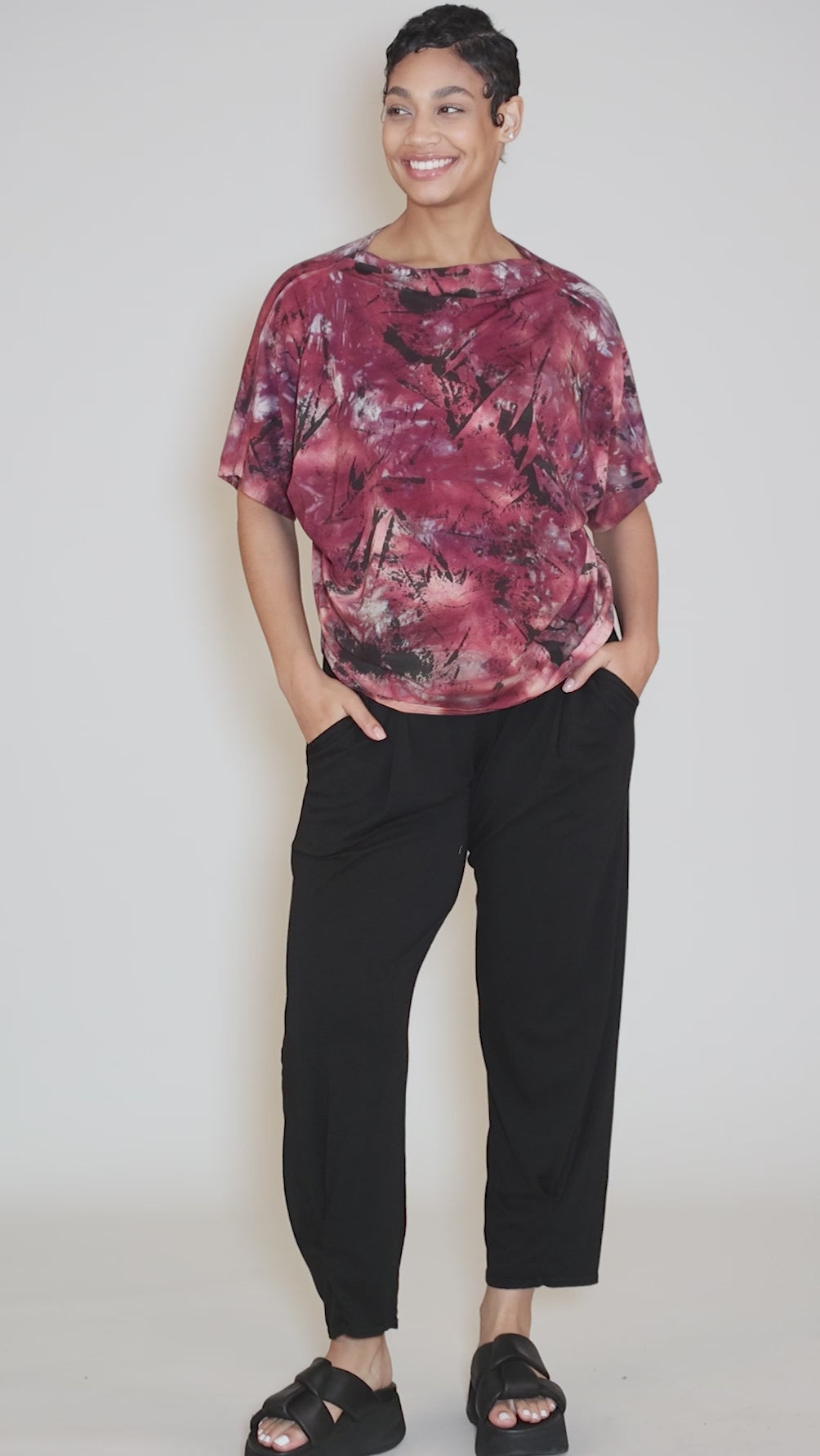 This fabric is absolutely scrumptious, a sensuous blend of bamboo and cotton, with excellent drape and offering extraordinary comfort. Jordan has a twist detail at the self waistband, with slit pockets on the hips and full legs that taper gently to the ankle. Running true to size to slightly small for the brand.