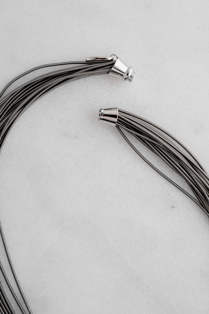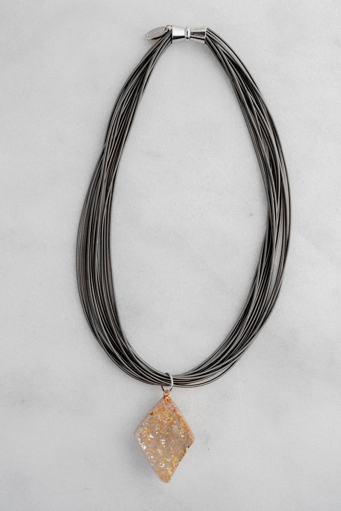 This multi-strand necklace has a quiet, modern feel, with warm, natural stones that catches the light. The contrast is what makes it special: industrial and airy, earthy and radiant. Easy to wear, easy to layer, and the magnetic closure makes it a true grab-and-go piece that still looks intentional.