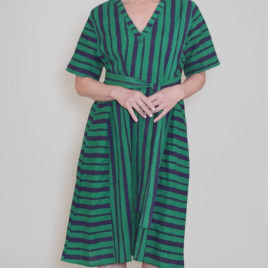 Made in a crisp cotton poplin, Karissa has a V-neckline and a relaxed, A-line silhouette. A self-belt allows for customized cinching at the waist, if so desired! Patch pockets sit on the hips.